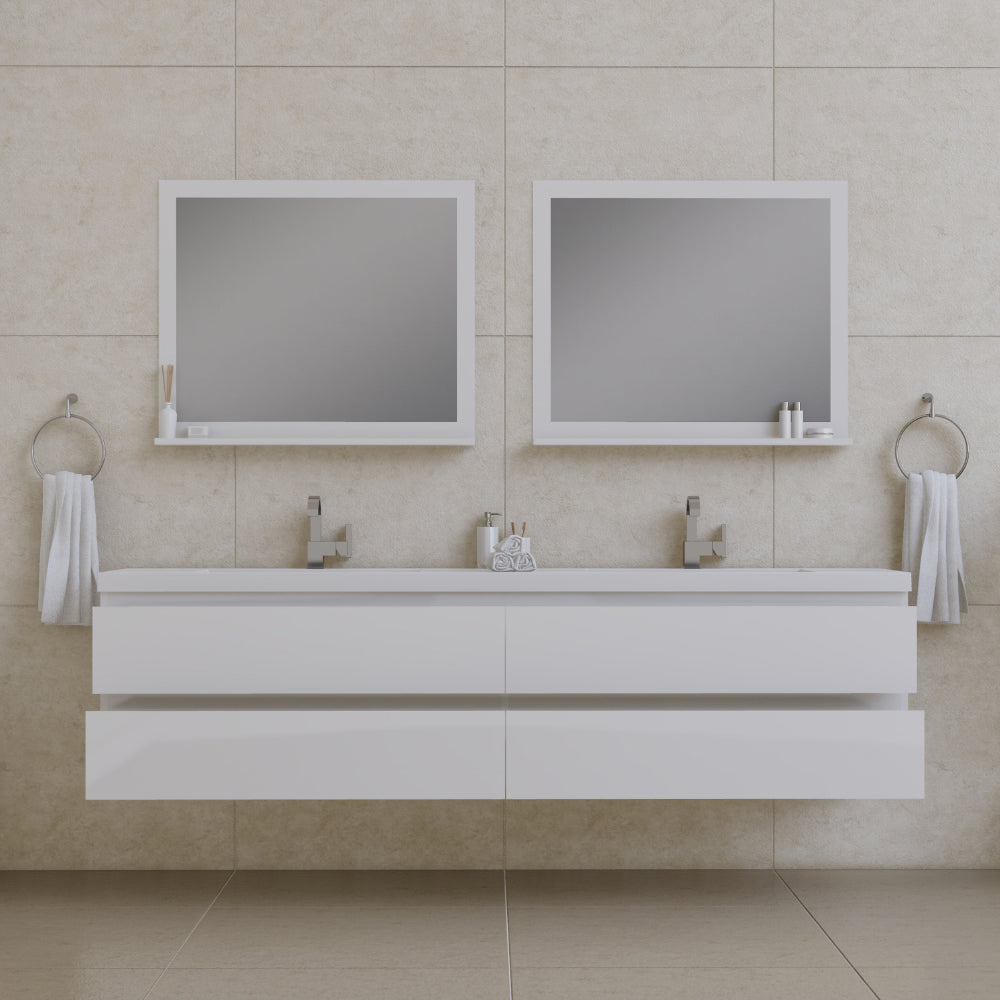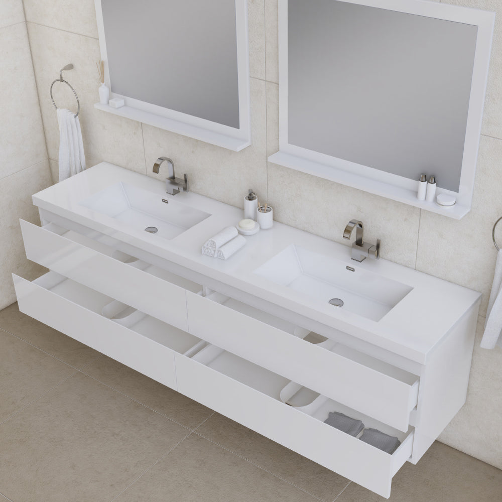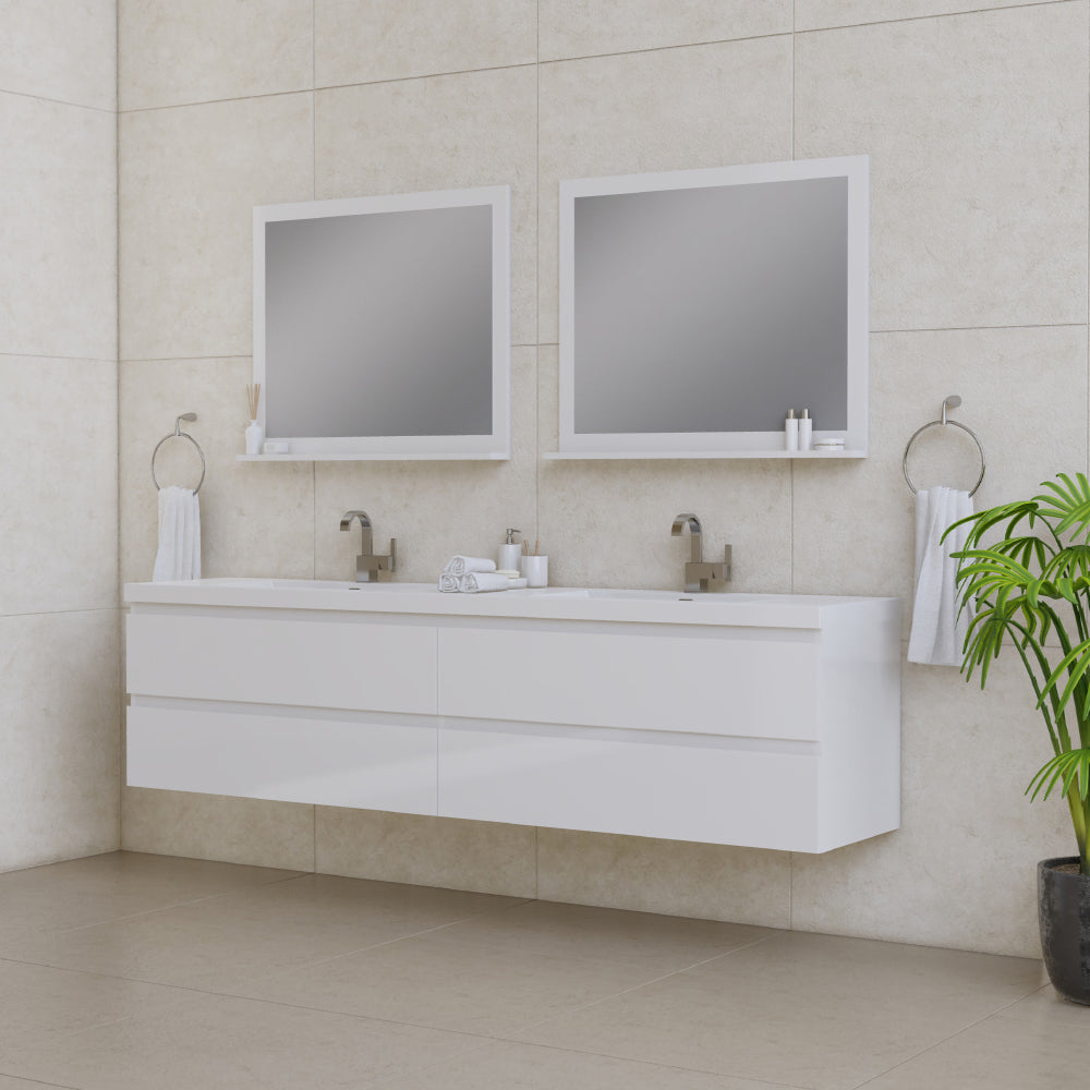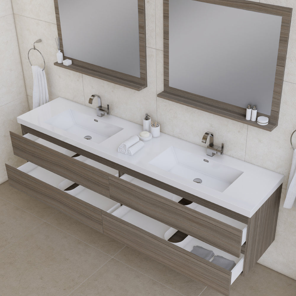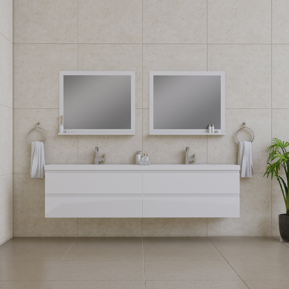 Alya Bath Paterno 84 inch double wall mounted bathroom vanity gives an updated modern look to any bathroom. This wall hung vanity offers great storage with four drawers