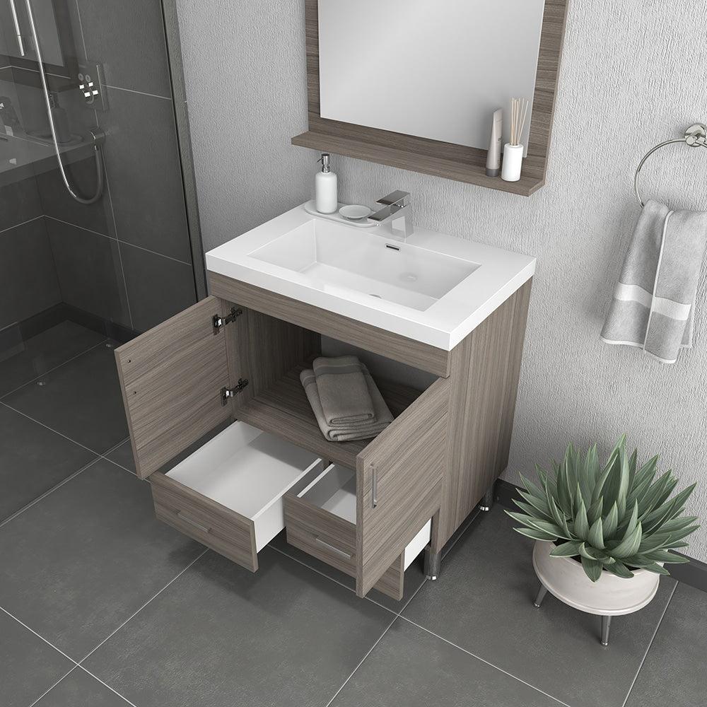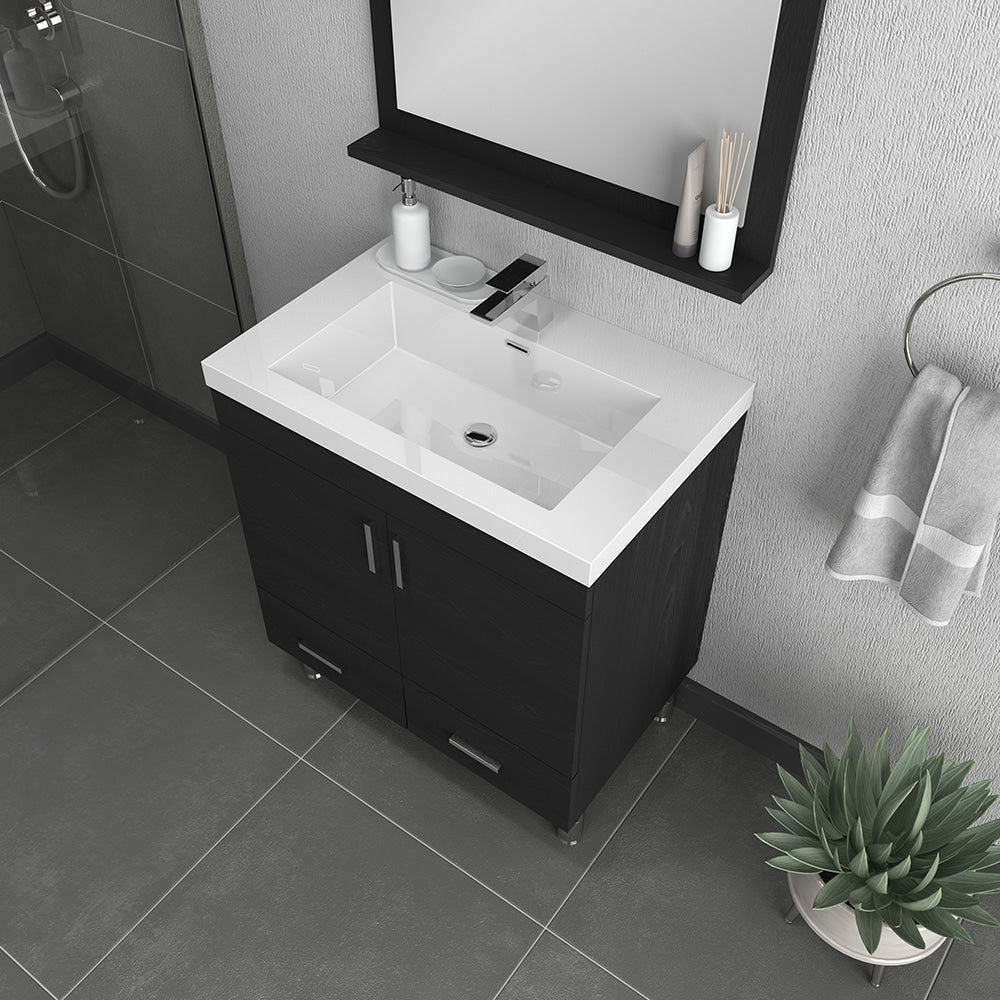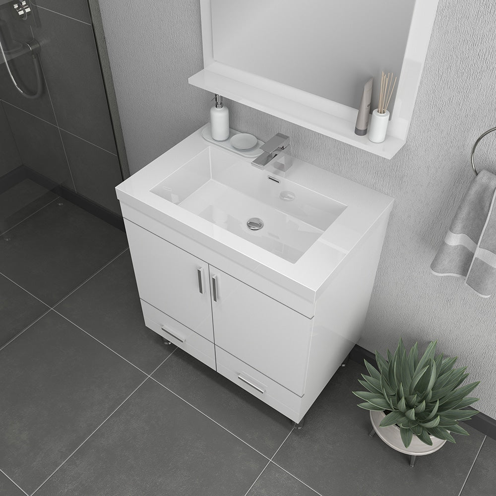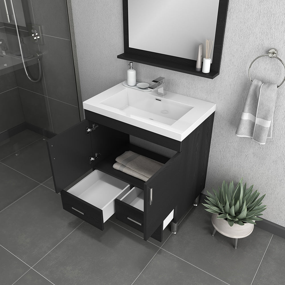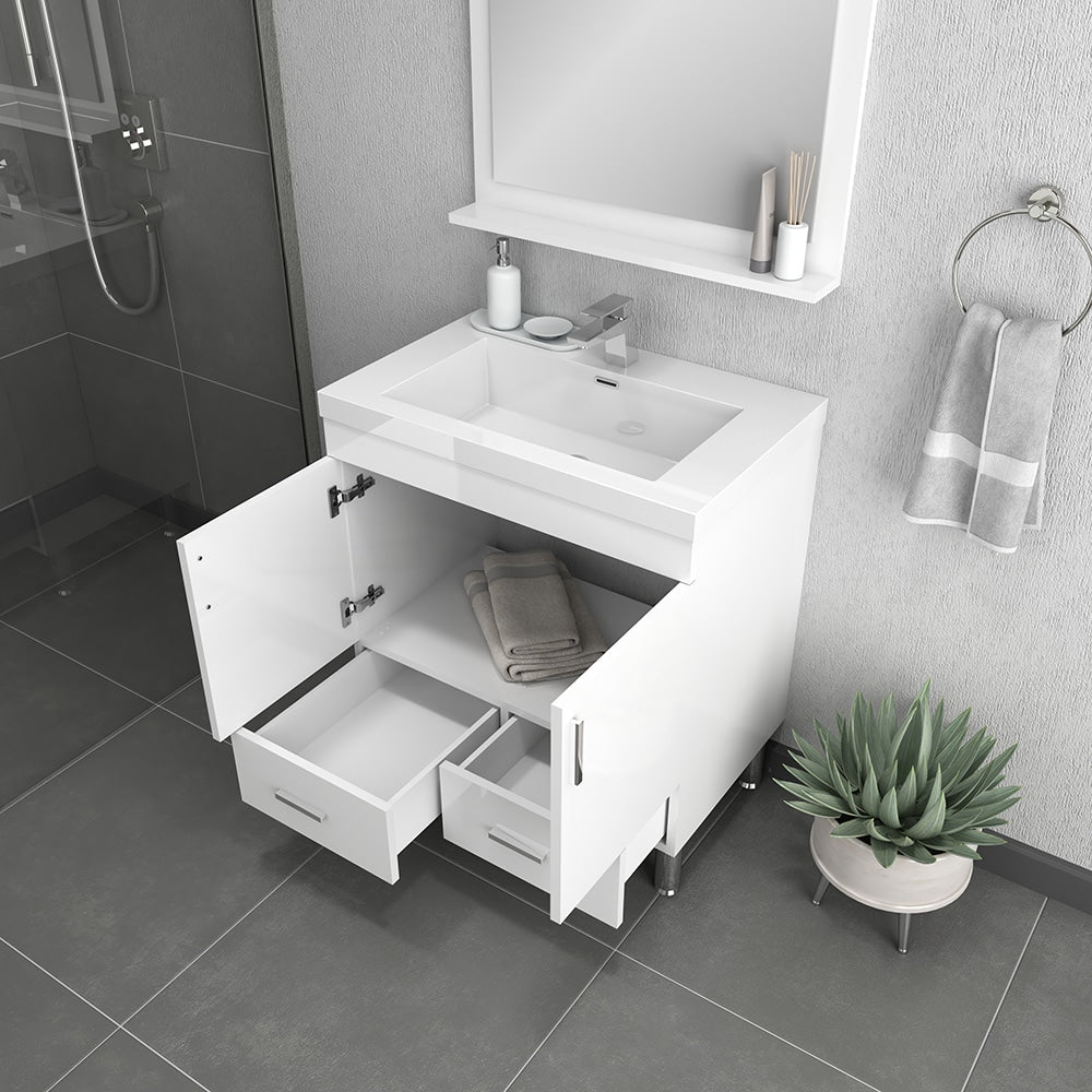 Alya Bath Ripley Collection 30 inch modern bathroom vanity is designed to give you more space. Features two doors and two soft closing drawers at the bottom of the cabinet that are ideal for placing extra toiletries, towels and other bathroom essentials. The white integrated acrylic sink gives it a total clean modern look. This vanity will give a one of a kind sleek and contemporary look to your bathroom.