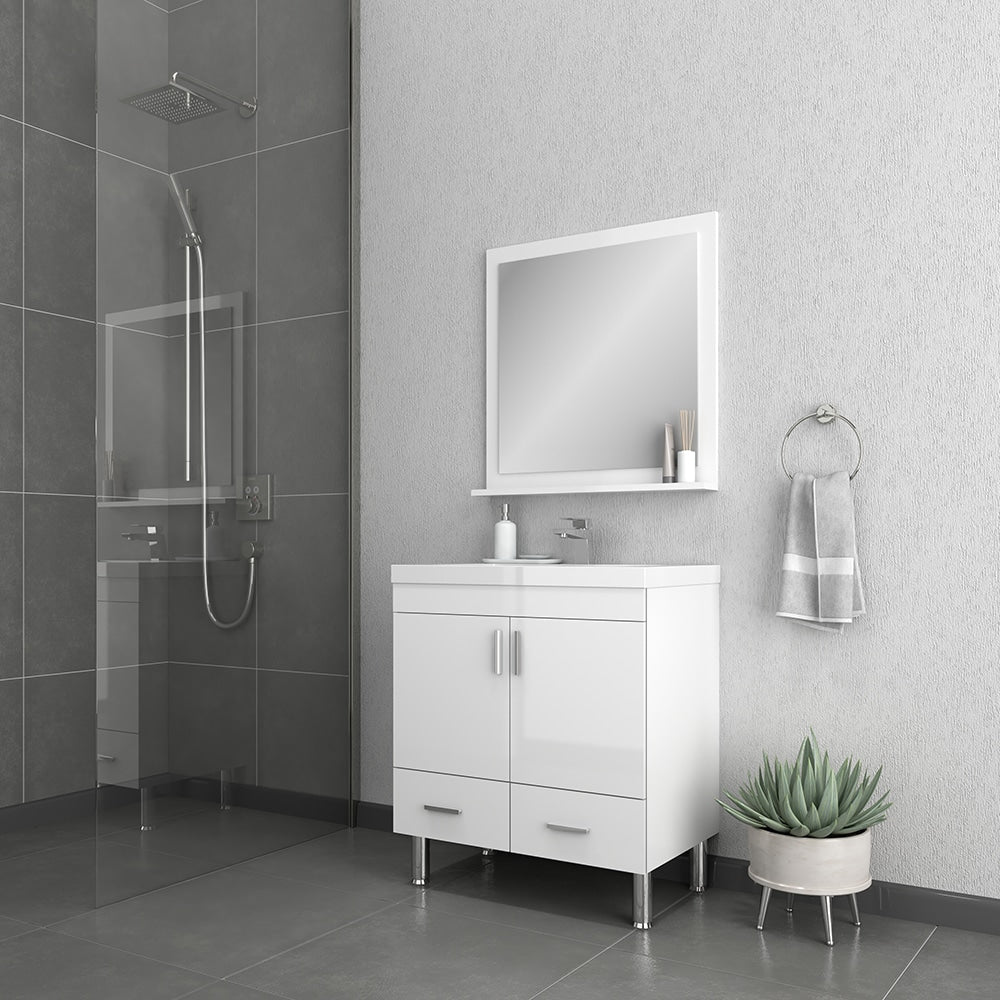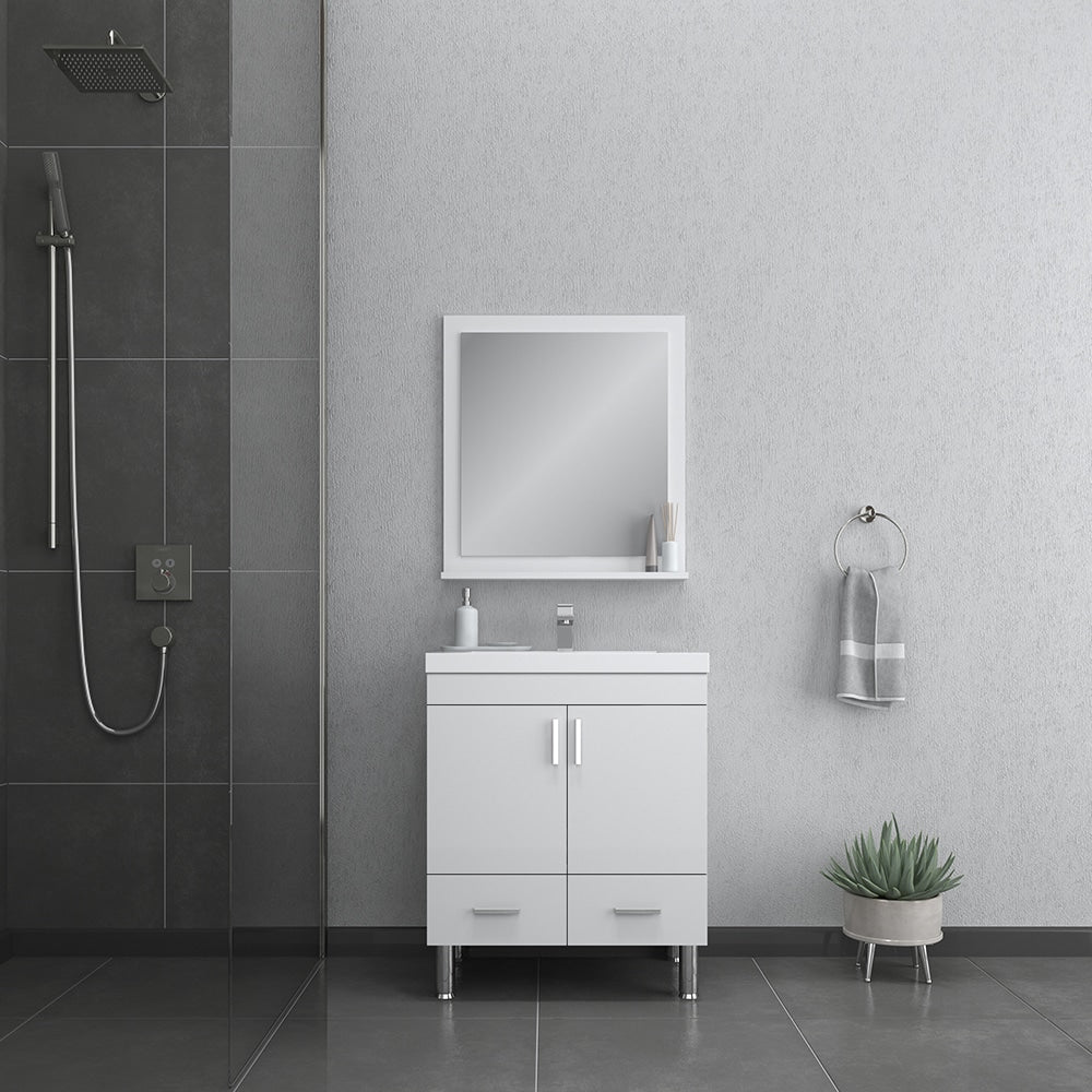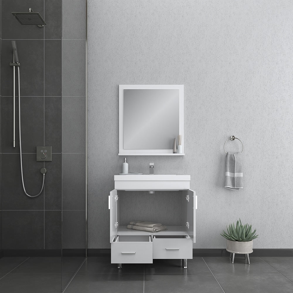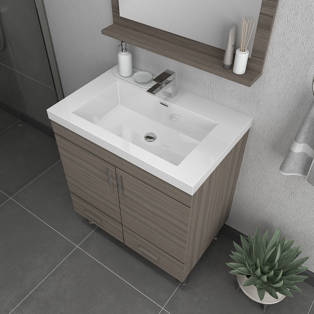 Alya Bath Ripley Collection 30 inch modern bathroom vanity is designed to give you more space. Features two doors and two soft closing drawers at the bottom of the cabinet that are ideal for placing extra toiletries, towels and other bathroom essentials. The white integrated acrylic sink gives it a total clean modern look. This vanity will give a one of a kind sleek and contemporary look to your bathroom.