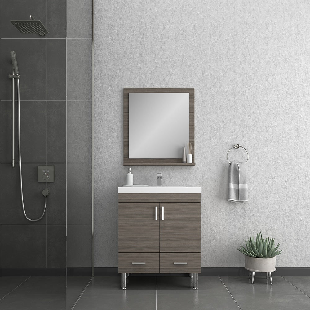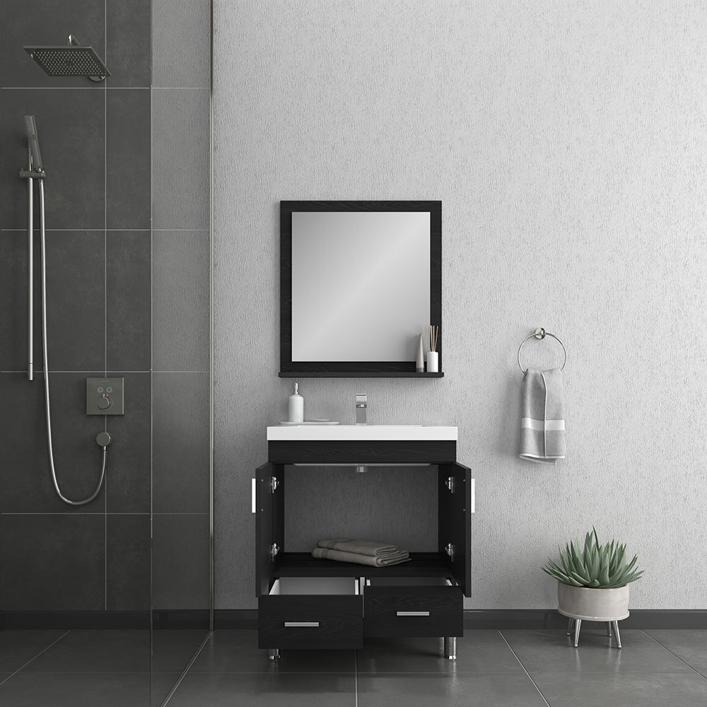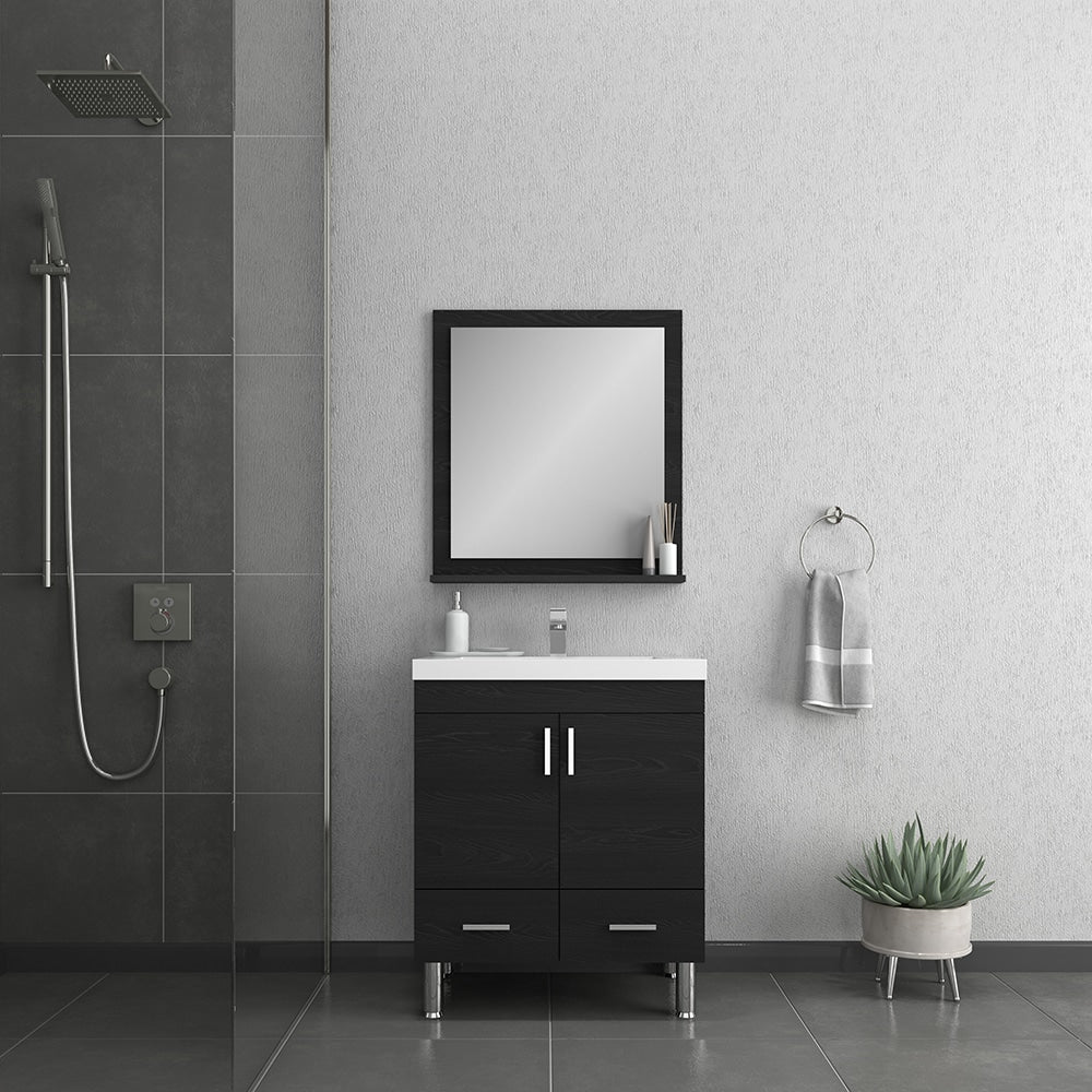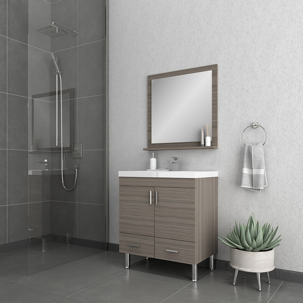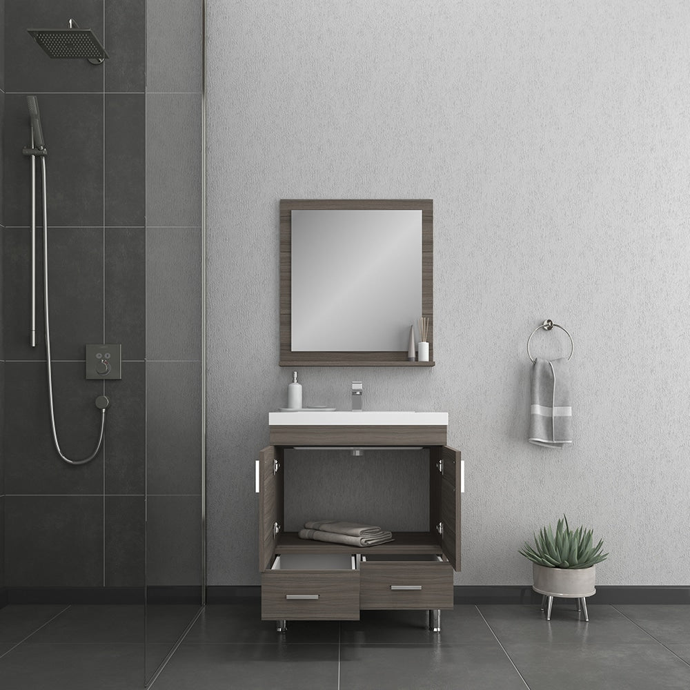 Alya Bath Ripley Collection 30 inch modern bathroom vanity is designed to give you more space. Features two doors and two soft closing drawers at the bottom of the cabinet that are ideal for placing extra toiletries, towels and other bathroom essentials. The white integrated acrylic sink gives it a total clean modern look. This vanity will give a one of a kind sleek and contemporary look to your bathroom.