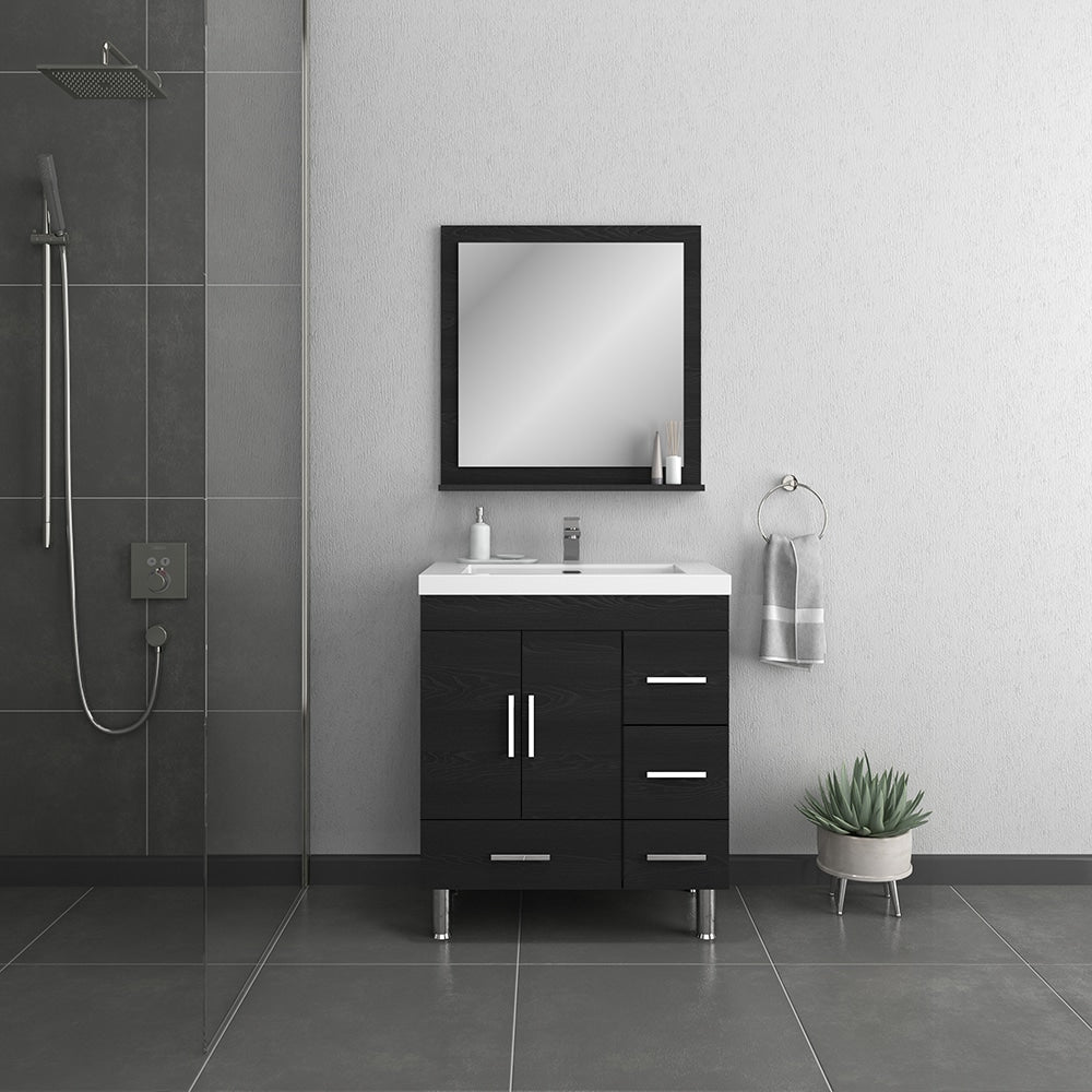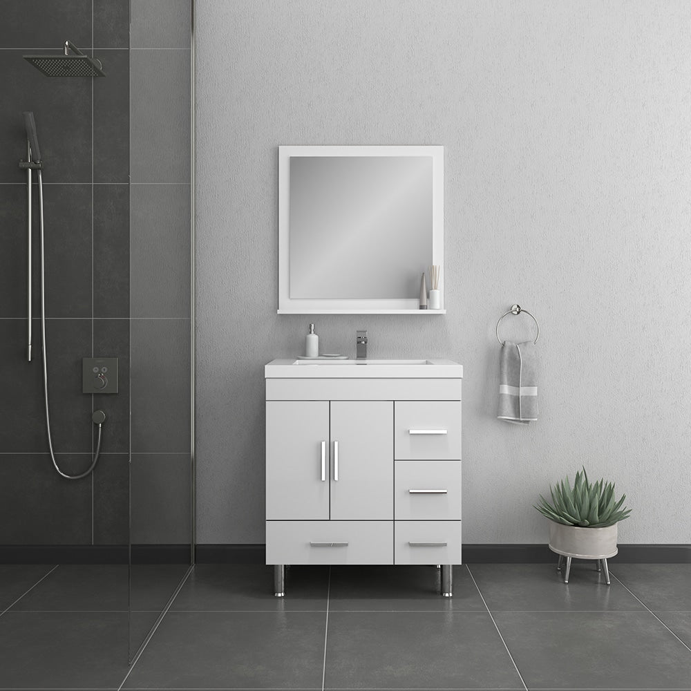 Alya Bath Ripley Collection 30 inch modern bathroom vanity with drawers is designed to give you more space. Features two doors and four soft closing drawers that are ideal for placing extra toiletries, towels and other bathroom essentials. The white integrated acrylic sink gives it a total clean modern look. This vanity will give a one of a kind sleek and contemporary look to your bathroom.