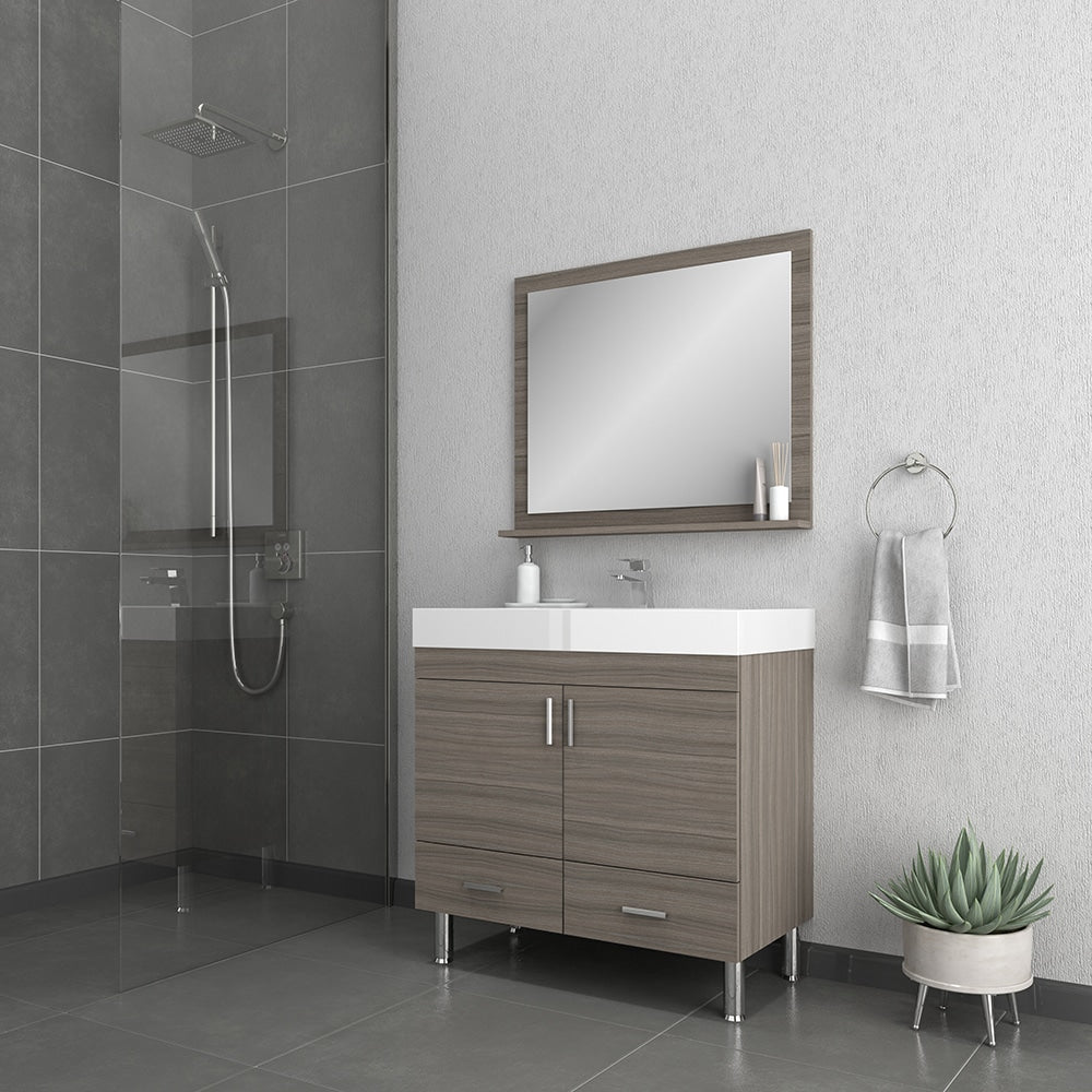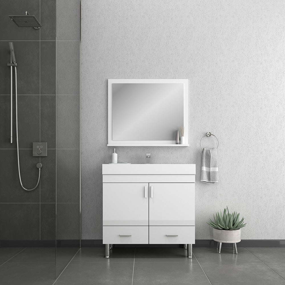 Alya Bath Ripley Collection 36 inch modern bathroom vanity. This single vanity has plenty of countertop space, and two self-closing drawers with large cabinet that offers great storage for all bathroom essentials. Integrated acrylic sink gives sleek and contemporary look. An optional mirrored medicine cabinet, with matching finish, can help you complete your bathroom design.