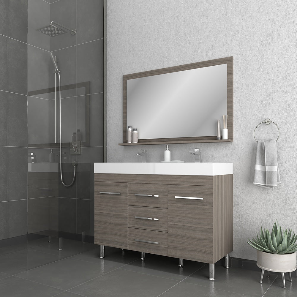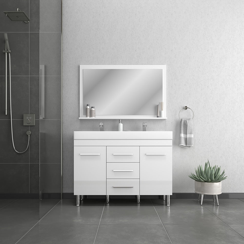 Alya Bath Ripley Collection 48 inch double bathroom vanity combines the functionality of modern design with a classic charm. Soft-closing doors and drawers are conveniently located in a space-saving design. And the one-piece, integrated acrylic sink completes the one of a kind sleek and contemporary look in your bathroom. An optional one-piece, framed matching mirror can be paired as additional design elements.
