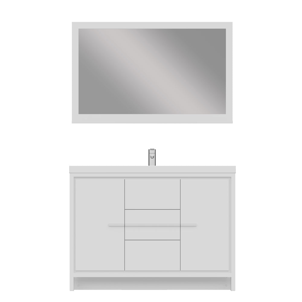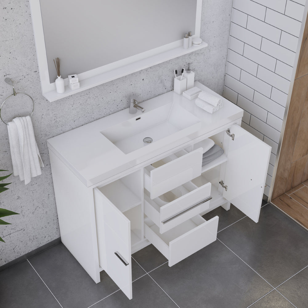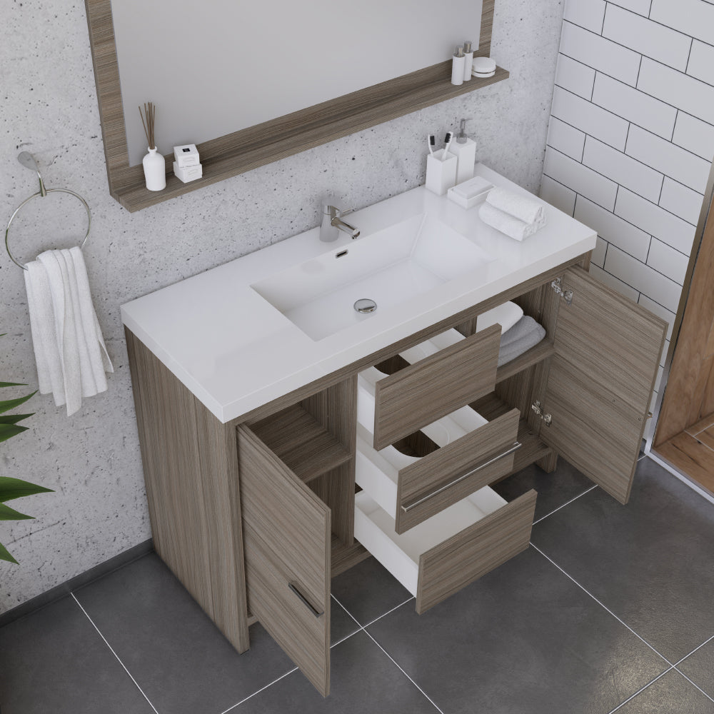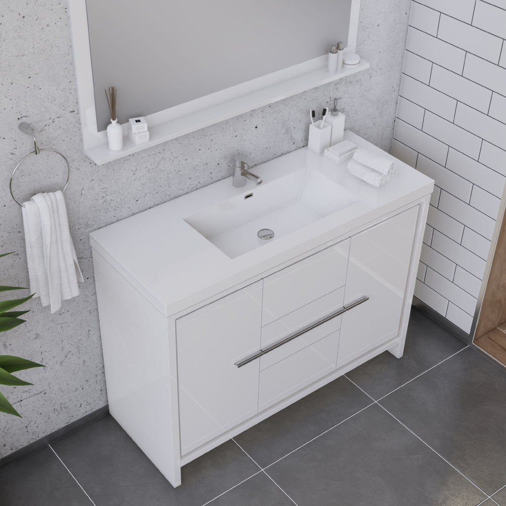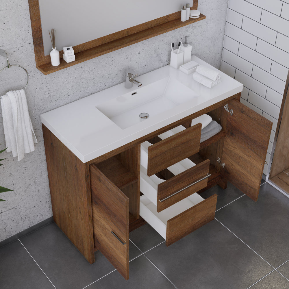 Alya Bath Sortino 48 inch bathroom vanity is a great choice for a modern bathroom. This free standing vanity offers great storage with a smooth soft-closing, fully functional three drawers and two doors. The white acrylic sink completes the simple contemporary design and clean lines brings a touch of modern into your bathroom.