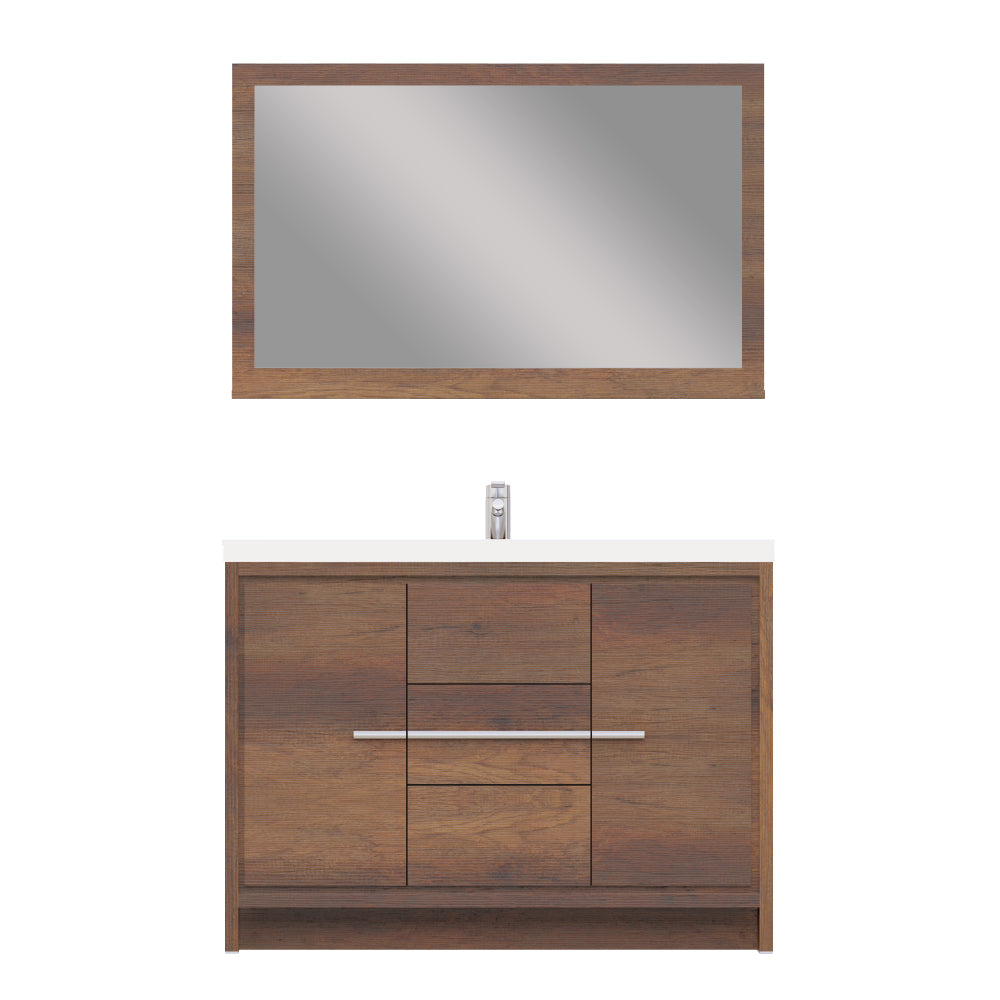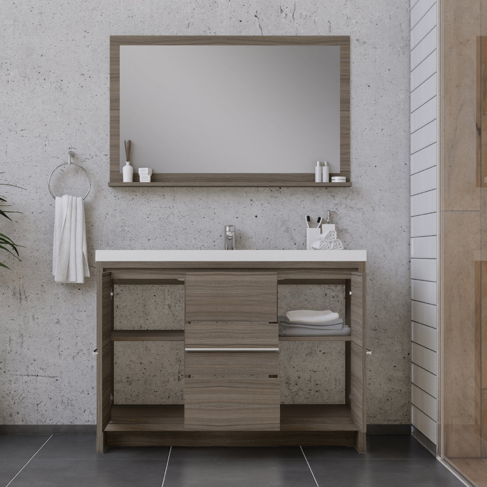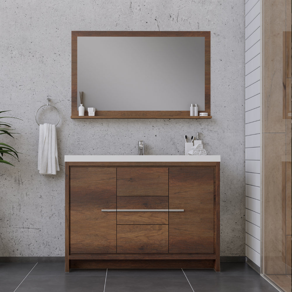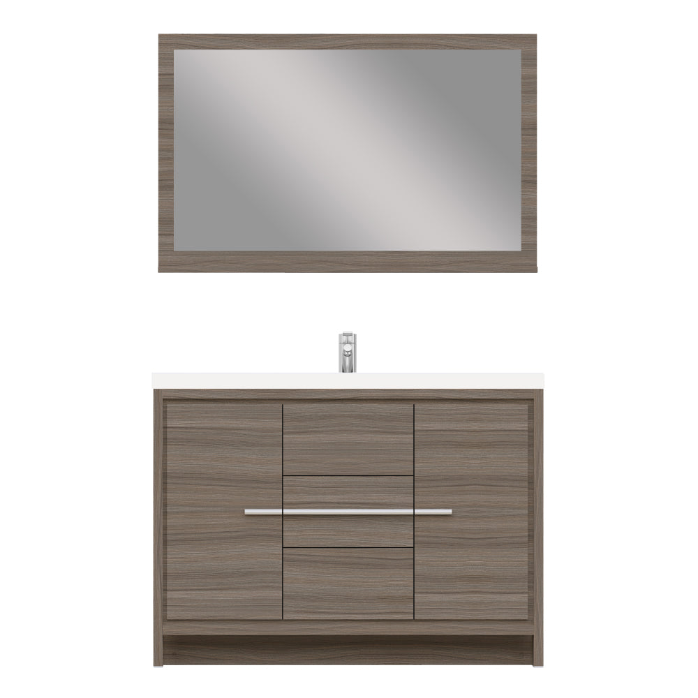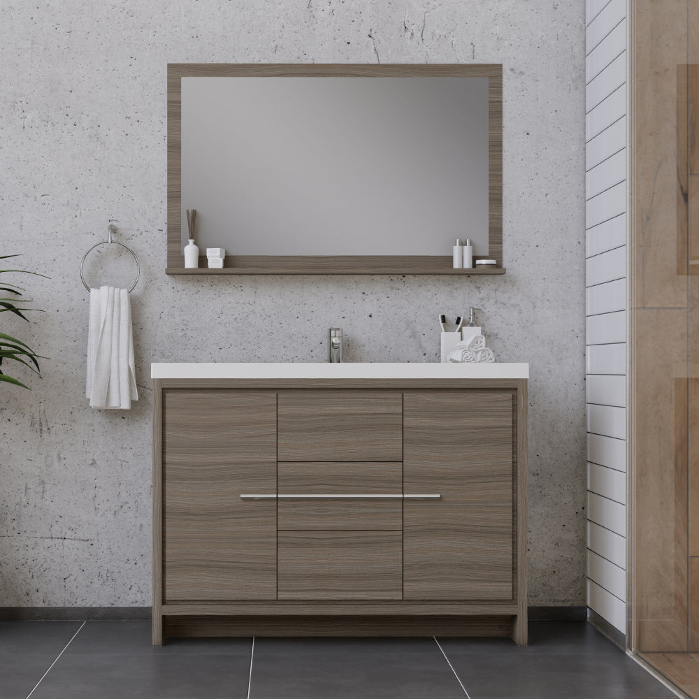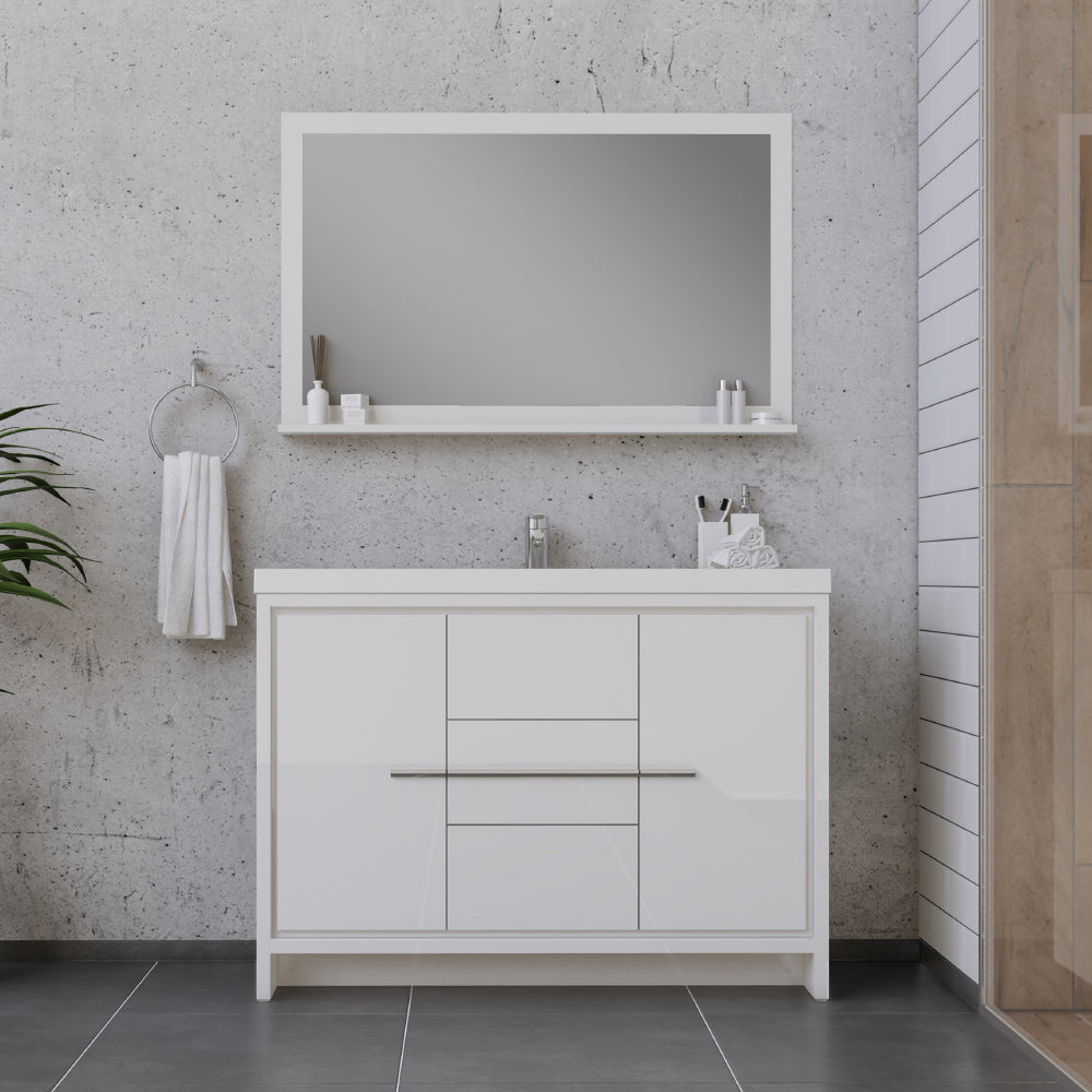 Alya Bath Sortino 48 inch bathroom vanity is a great choice for a modern bathroom. This free standing vanity offers great storage with a smooth soft-closing, fully functional three drawers and two doors. The white acrylic sink completes the simple contemporary design and clean lines brings a touch of modern into your bathroom.