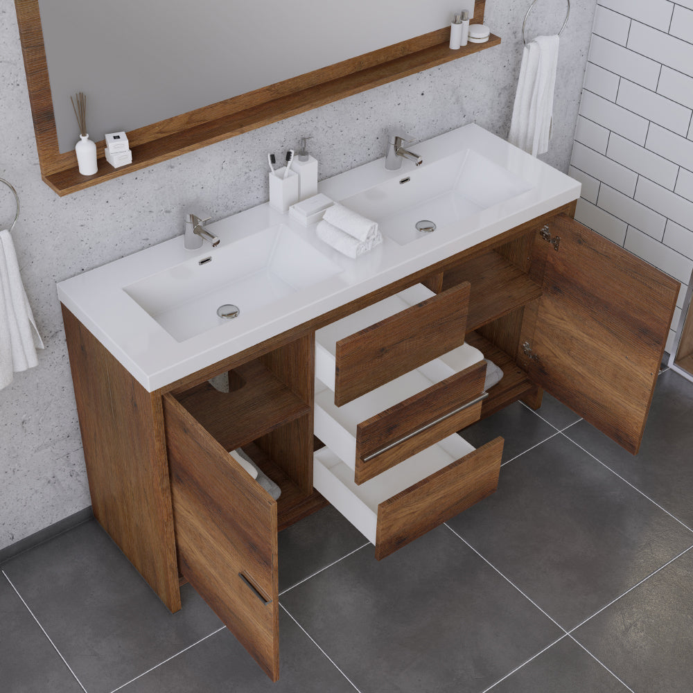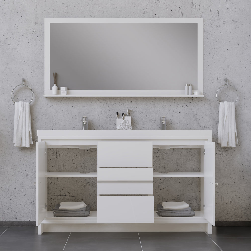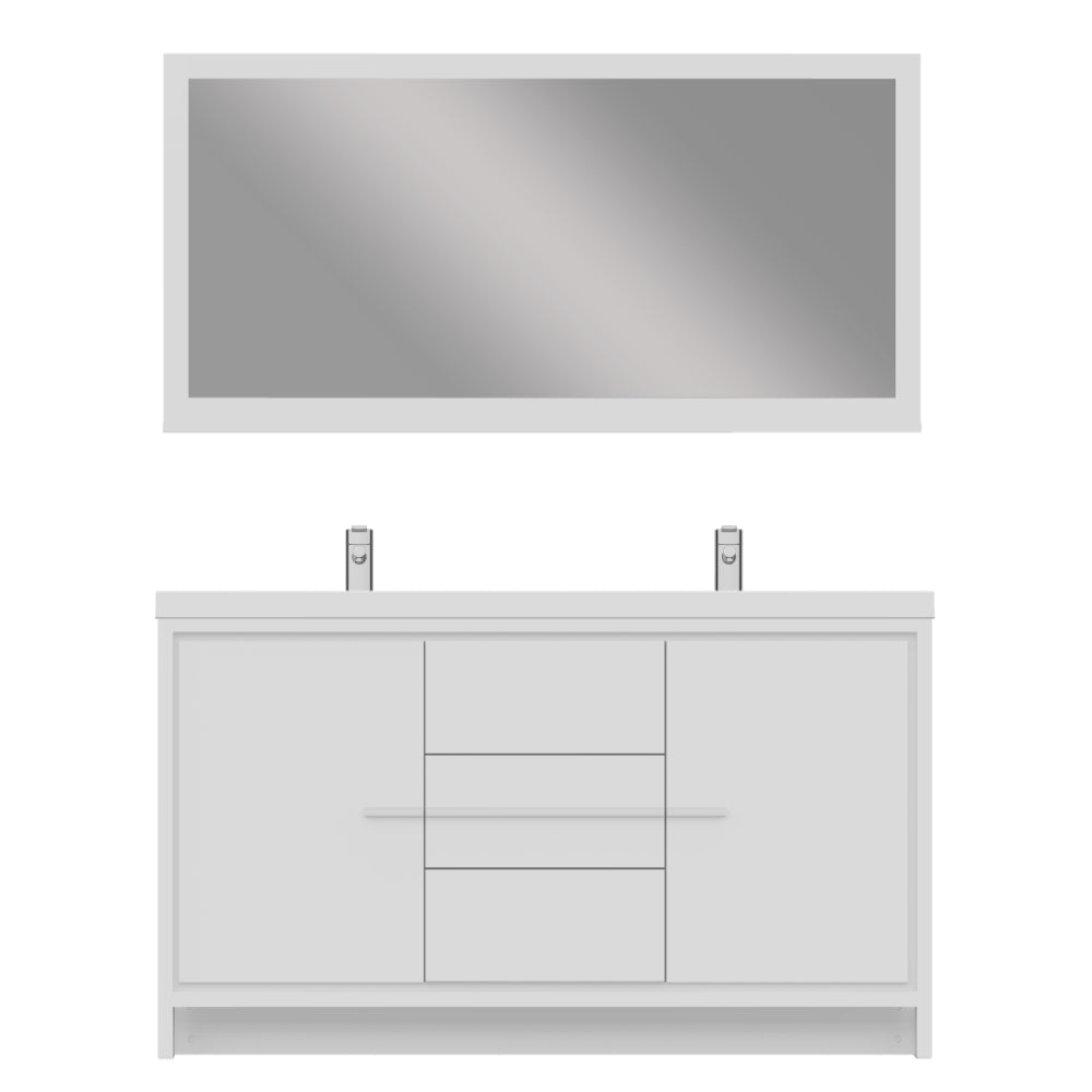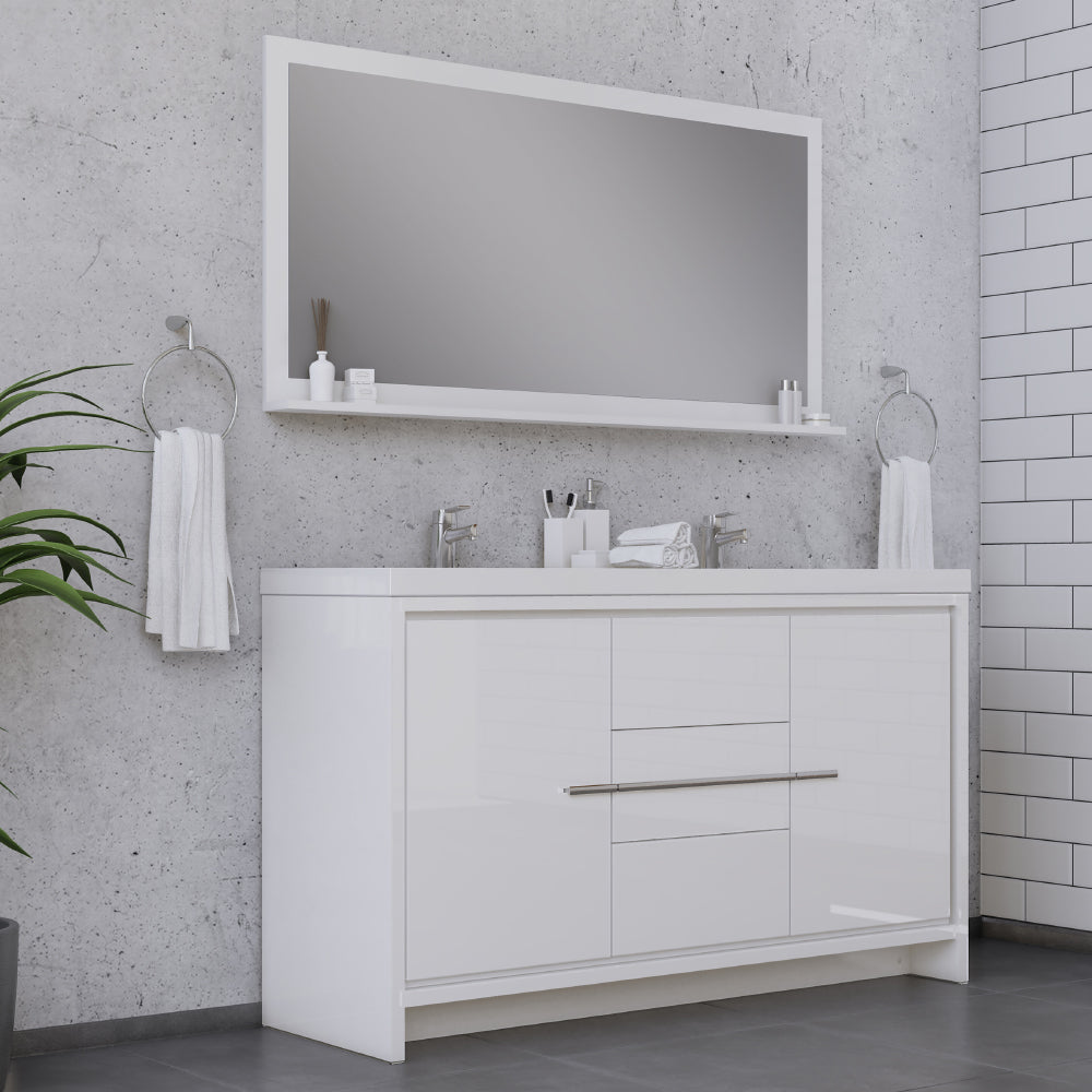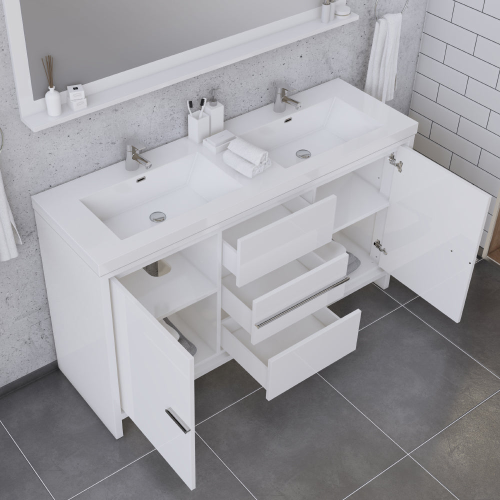 Alya Bath Sortino 60 inch double bathroom vanity is a great choice for a modern bathroom. This free standing vanity offers great storage with a smooth soft-closing, fully functional three drawers and two doors. The white acrylic sink completes the simple contemporary design and clean lines brings a touch of modern into your bathroom.