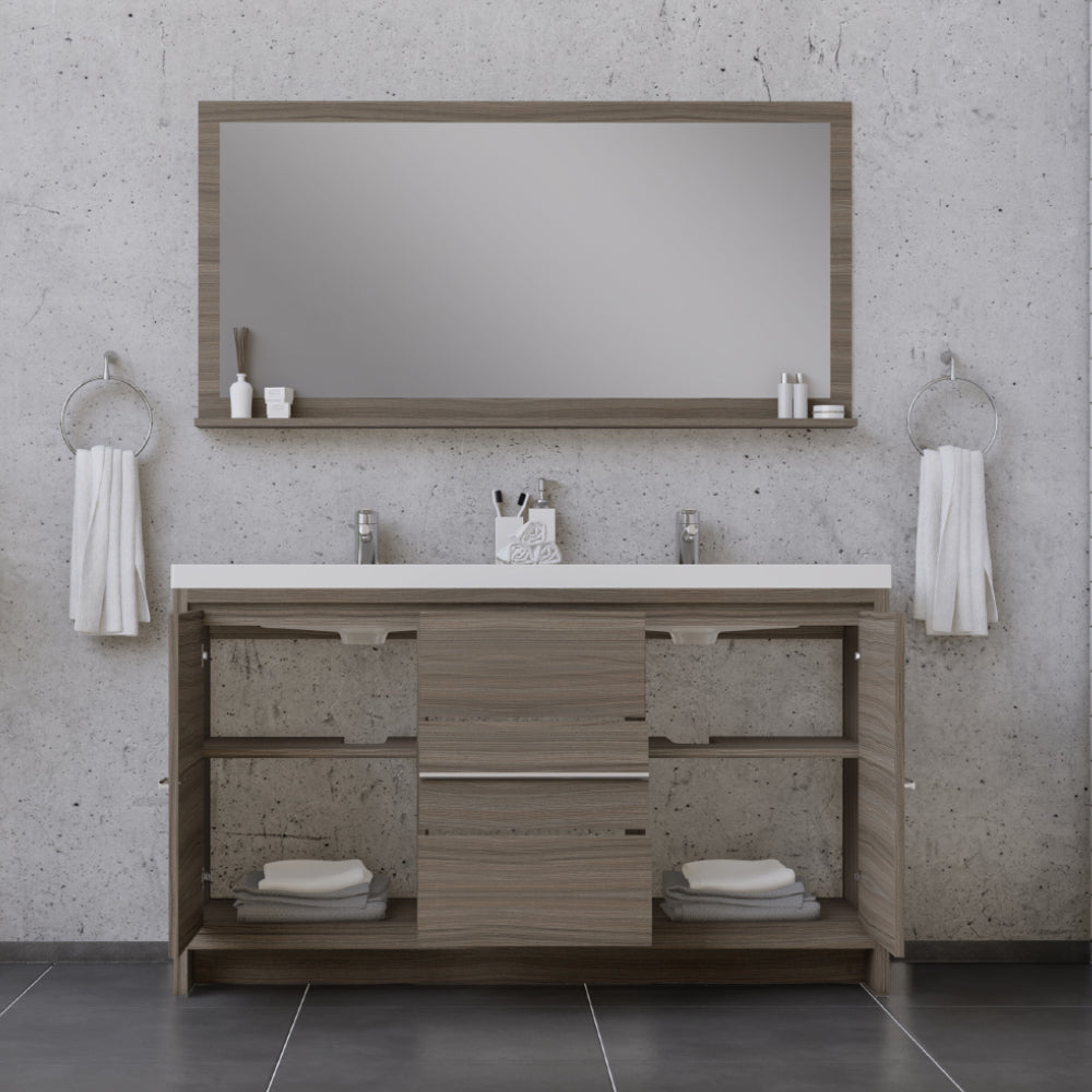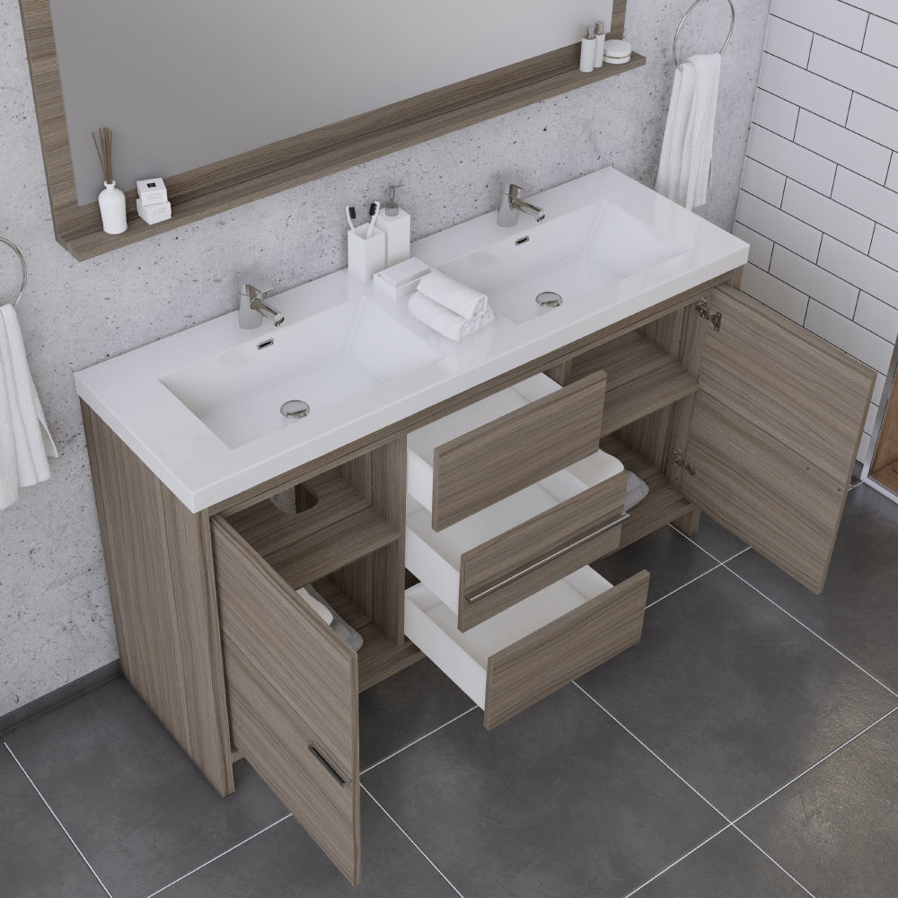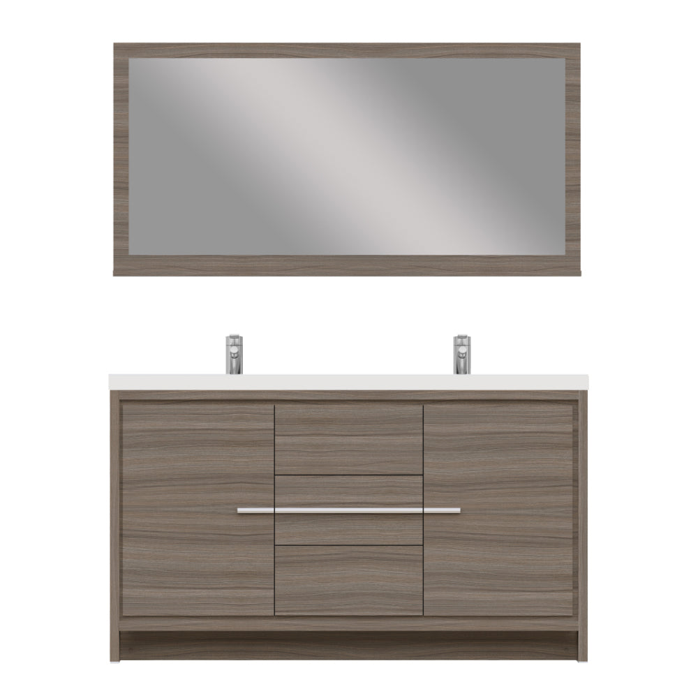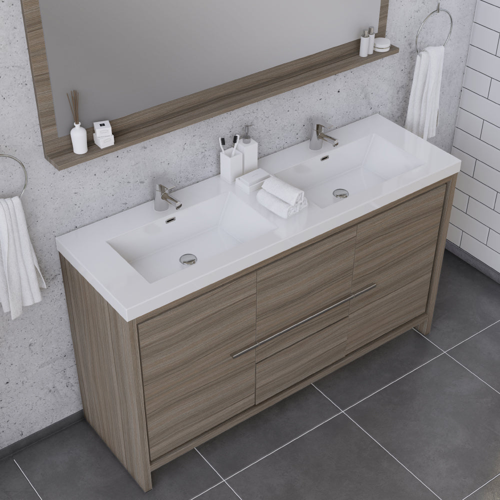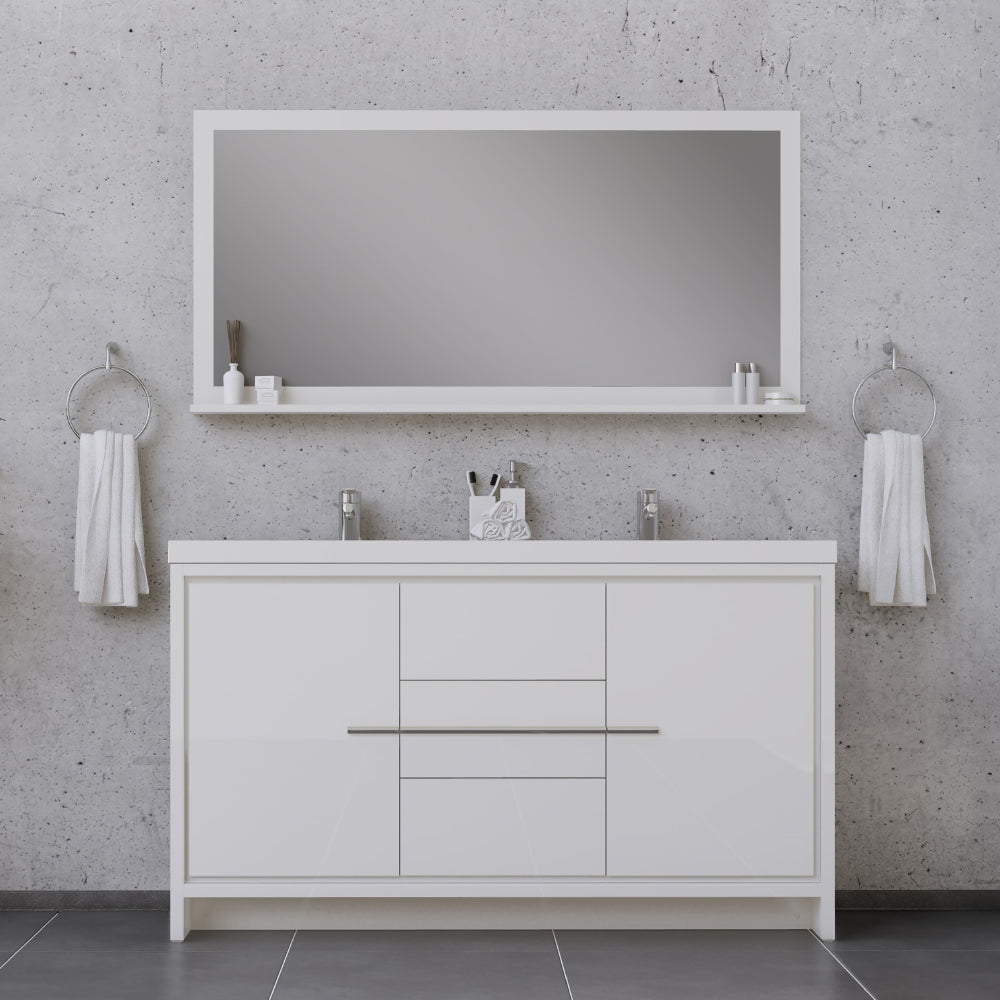 Alya Bath Sortino 60 inch double bathroom vanity is a great choice for a modern bathroom. This free standing vanity offers great storage with a smooth soft-closing, fully functional three drawers and two doors. The white acrylic sink completes the simple contemporary design and clean lines brings a touch of modern into your bathroom.