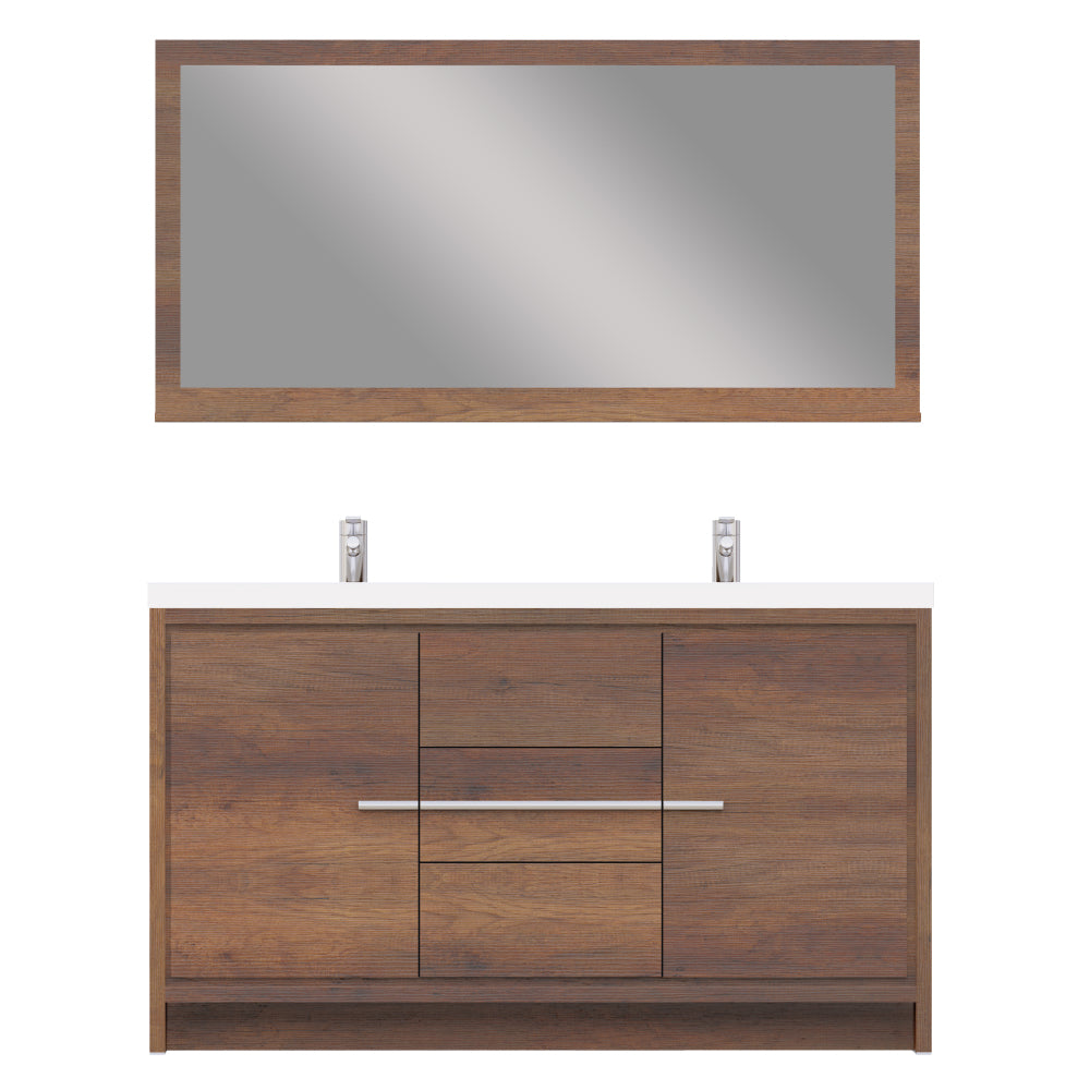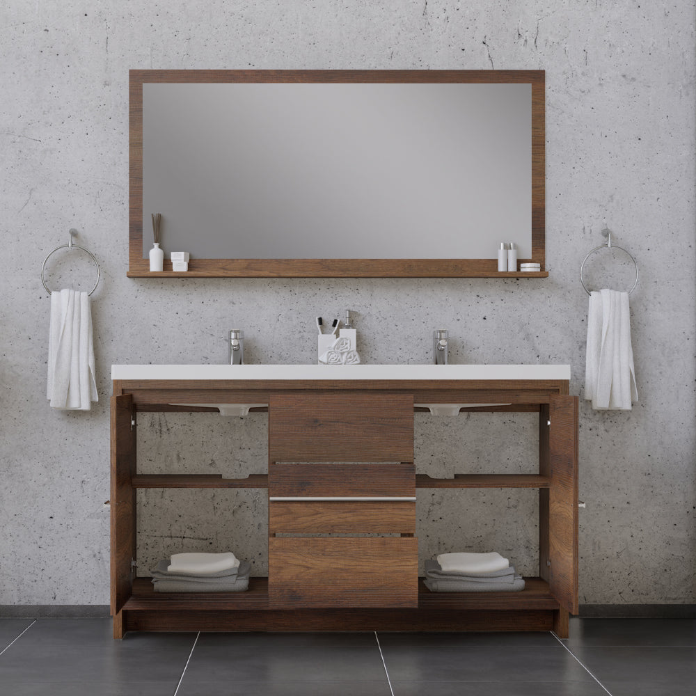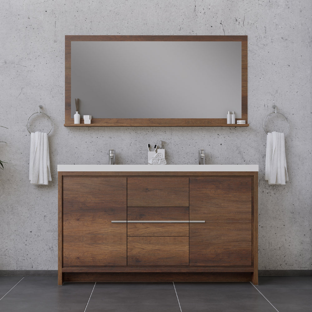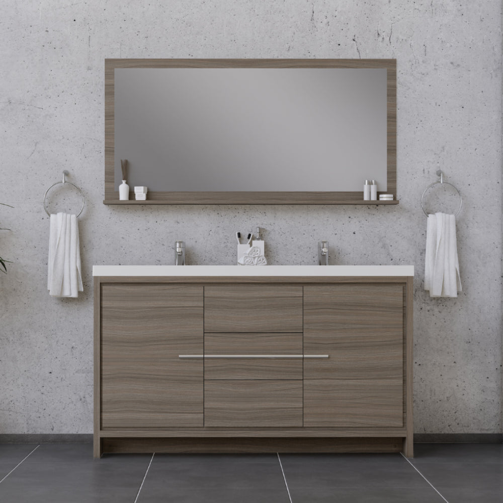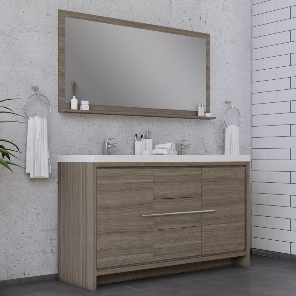 Alya Bath Sortino 60 inch double bathroom vanity is a great choice for a modern bathroom. This free standing vanity offers great storage with a smooth soft-closing, fully functional three drawers and two doors. The white acrylic sink completes the simple contemporary design and clean lines brings a touch of modern into your bathroom.