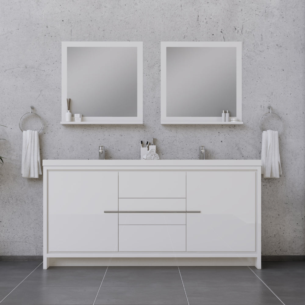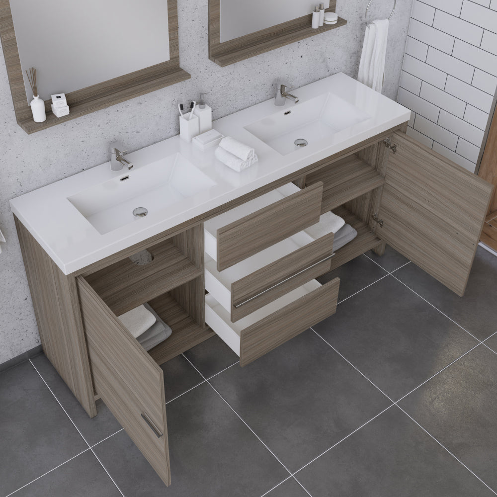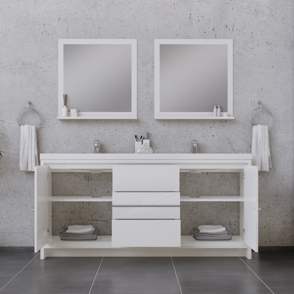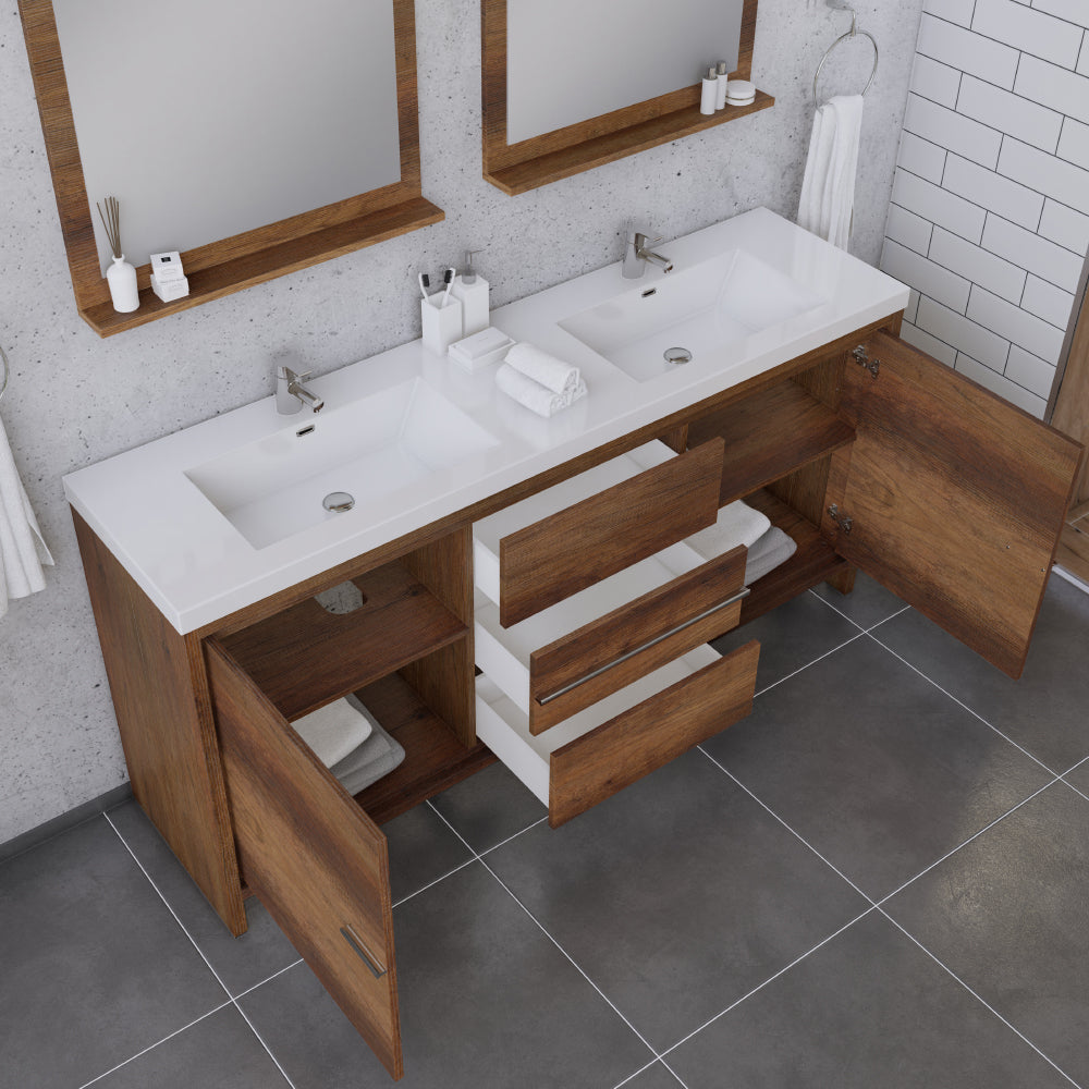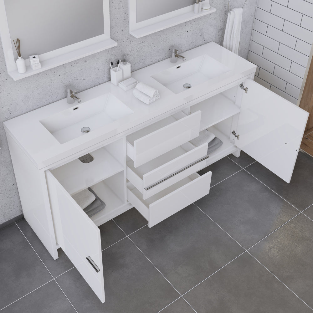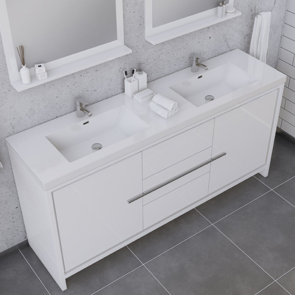 Alya Bath Sortino 72 inch double bathroom vanity is a great choice for a modern bathroom. This free standing vanity offers great storage with a smooth soft-closing, fully functional three drawers and two doors. The white acrylic sink completes the simple contemporary design and clean lines brings a touch of modern into your bathroom.