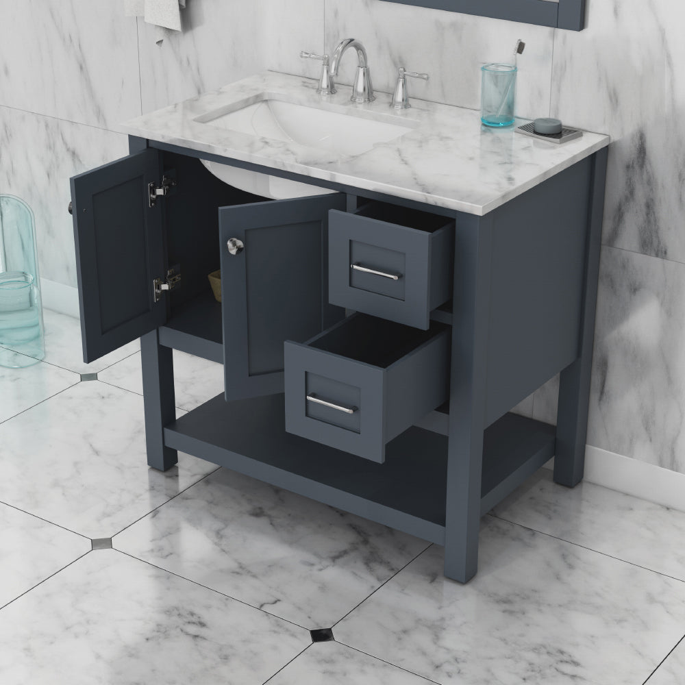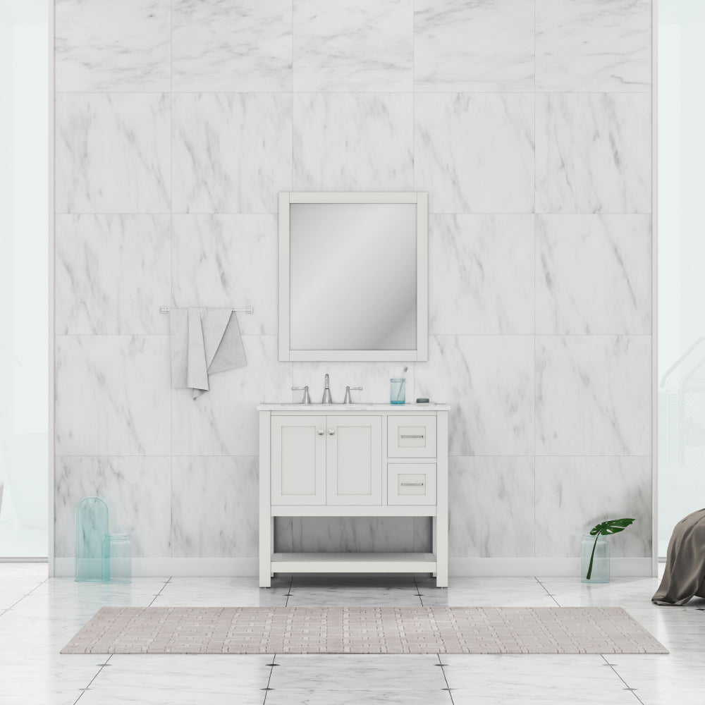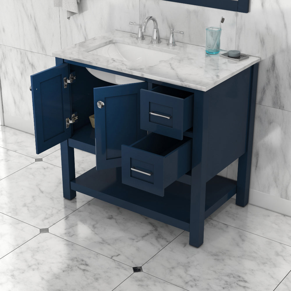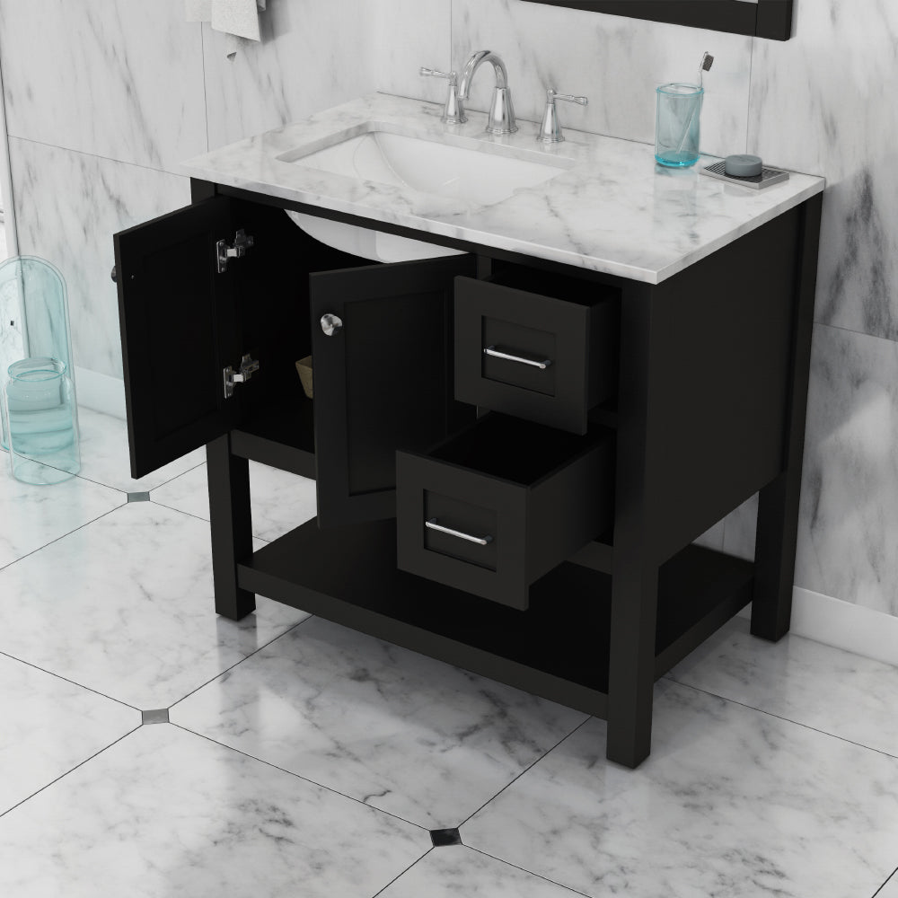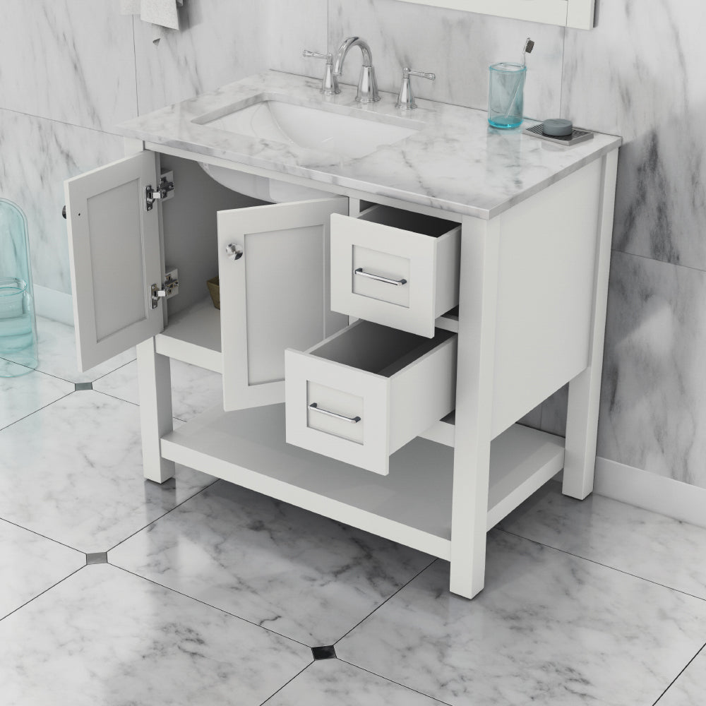 Alya Bath Wilmington Collection 36 inch bathroom vanity provides a contemporary design that is perfect for any bathroom remodel. This free standing, modern vanity built with solid wood construction, and offers two soft closing doors and two drawers with brushed nickel hardware. Each vanity comes fully assembled with the Carrara white marble top and ceramic sink is attached to the cabinet base for easy installation. This vanity has plenty of countertop space and a roomy open bottom shelf.