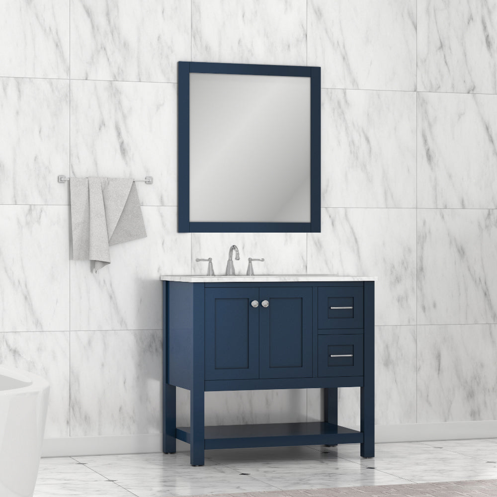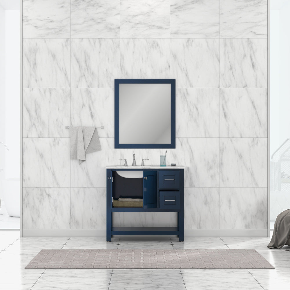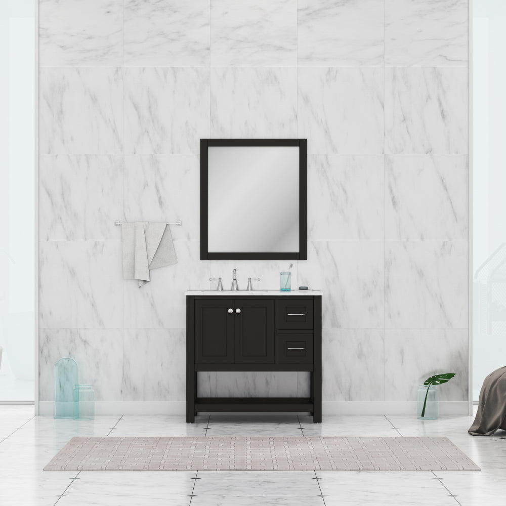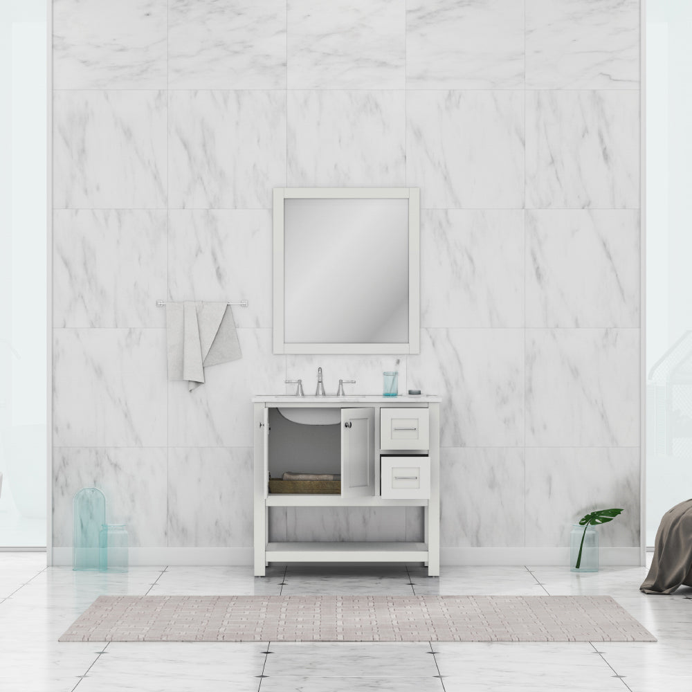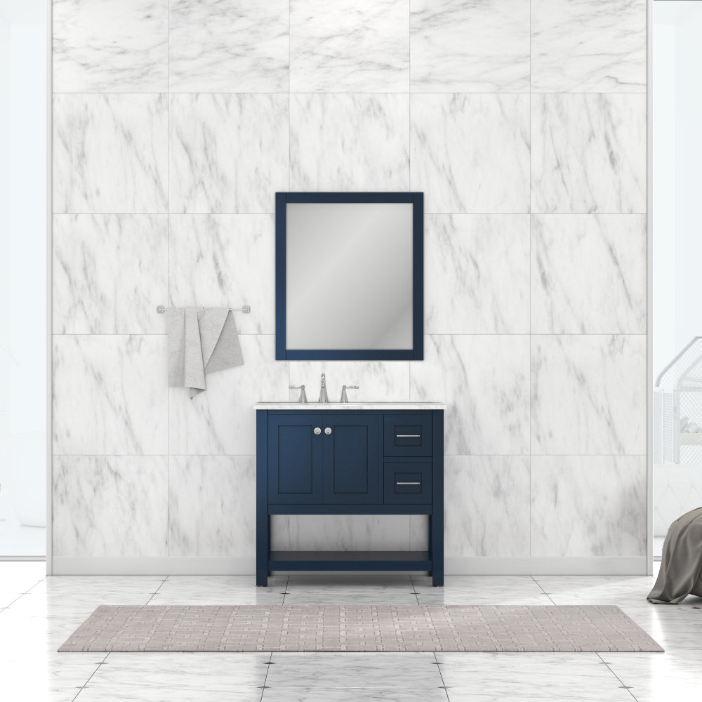 Alya Bath Wilmington Collection 36 inch bathroom vanity provides a contemporary design that is perfect for any bathroom remodel. This free standing, modern vanity built with solid wood construction, and offers two soft closing doors and two drawers with brushed nickel hardware. Each vanity comes fully assembled with the Carrara white marble top and ceramic sink is attached to the cabinet base for easy installation. This vanity has plenty of countertop space and a roomy open bottom shelf.