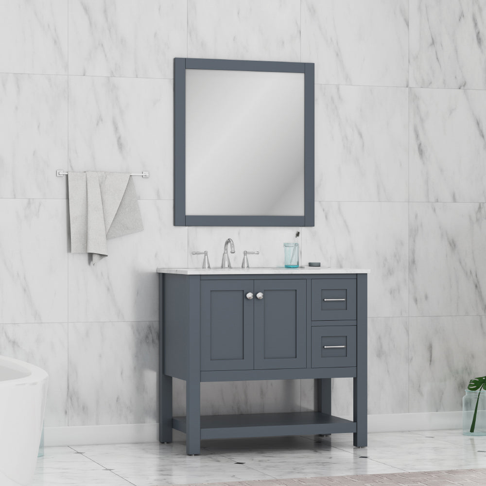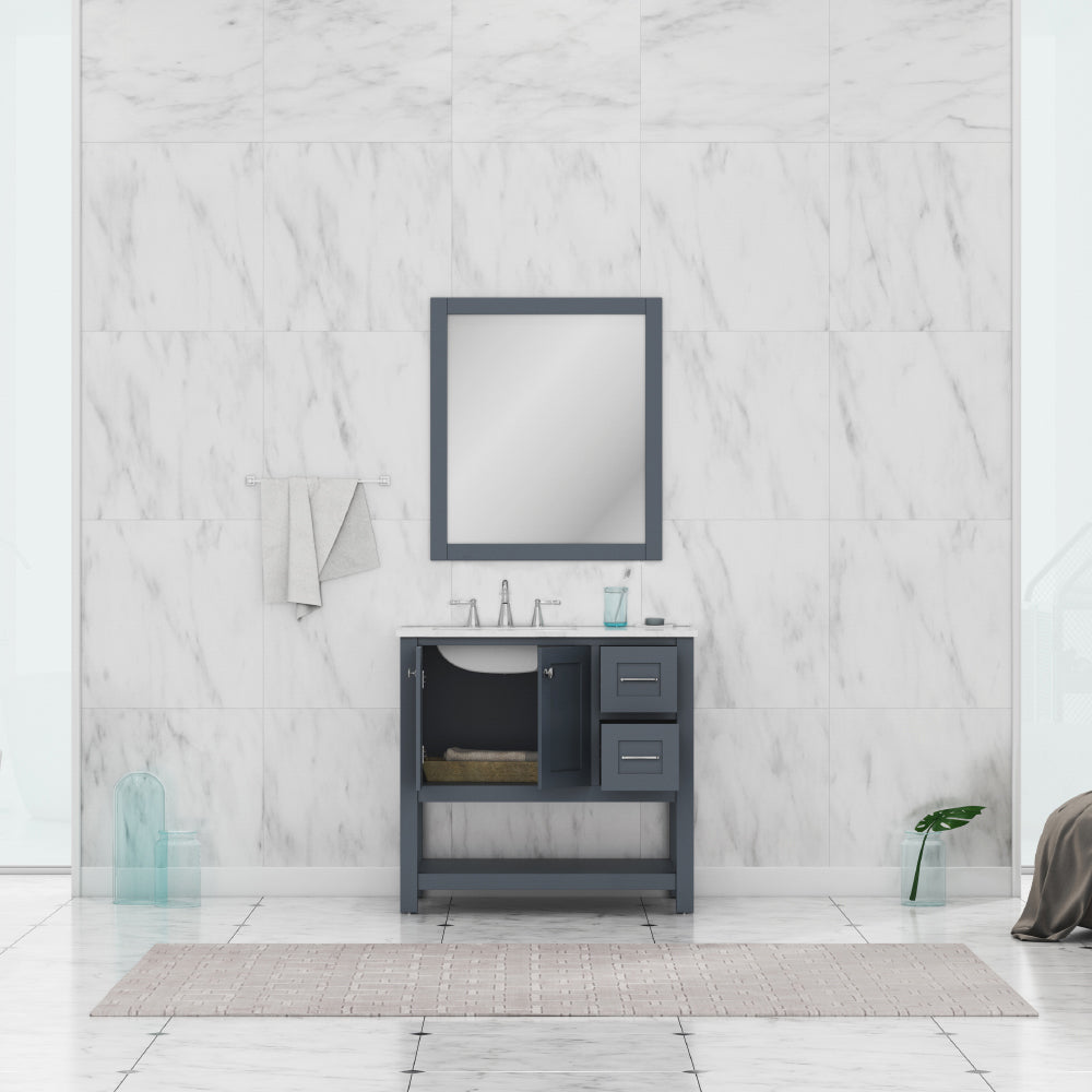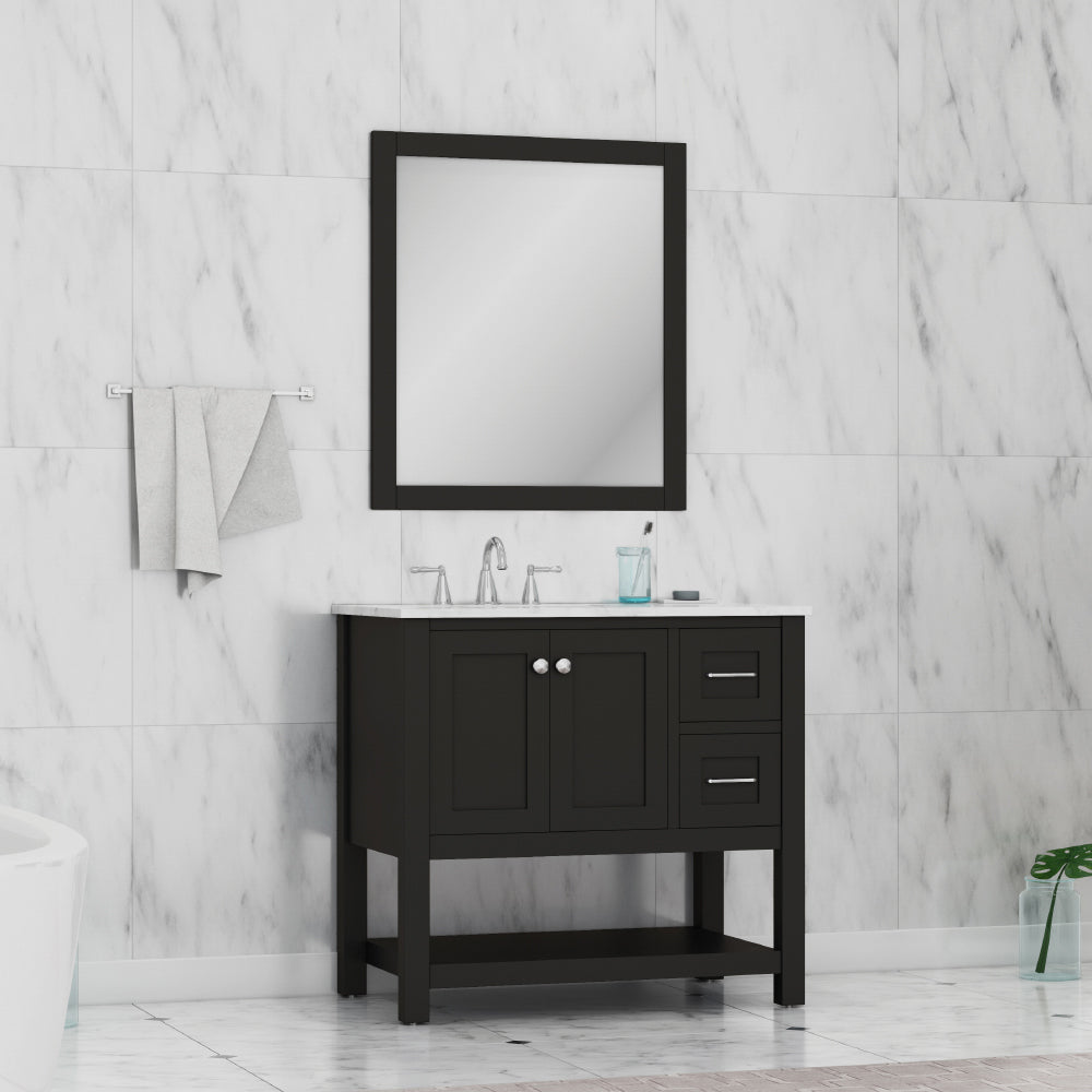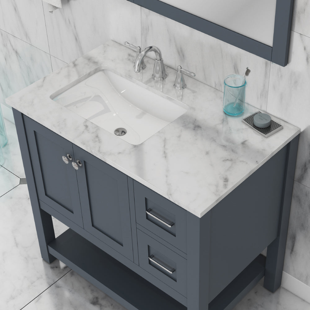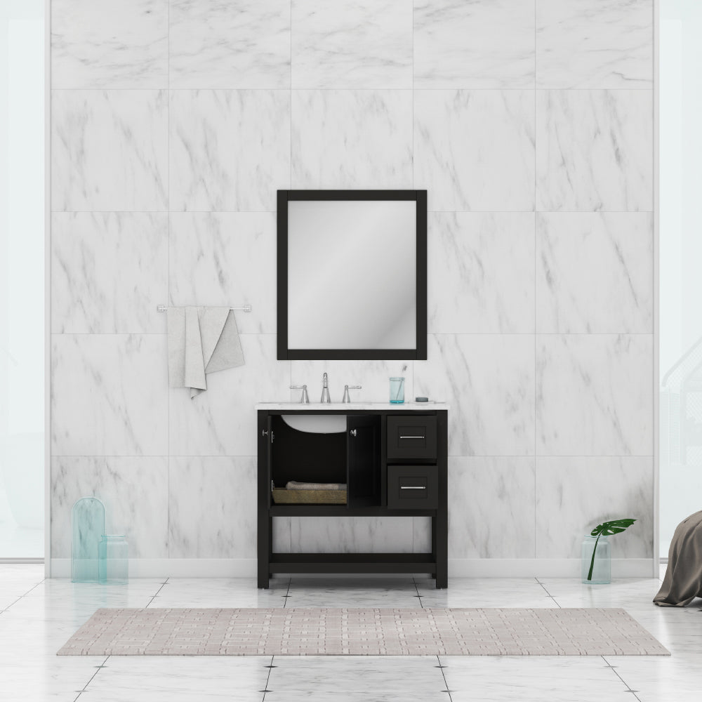 Alya Bath Wilmington Collection 36 inch bathroom vanity provides a contemporary design that is perfect for any bathroom remodel. This free standing, modern vanity built with solid wood construction, and offers two soft closing doors and two drawers with brushed nickel hardware. Each vanity comes fully assembled with the Carrara white marble top and ceramic sink is attached to the cabinet base for easy installation. This vanity has plenty of countertop space and a roomy open bottom shelf.