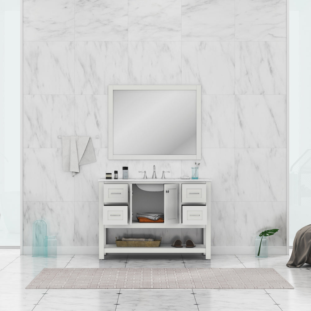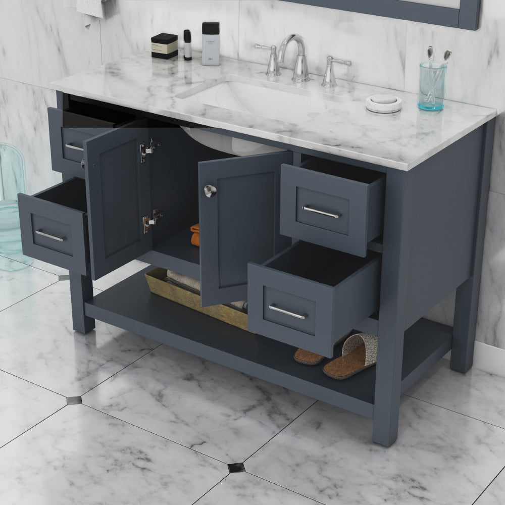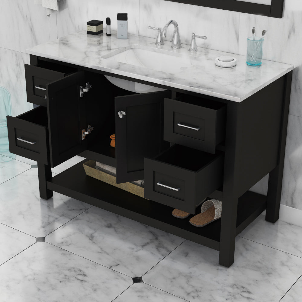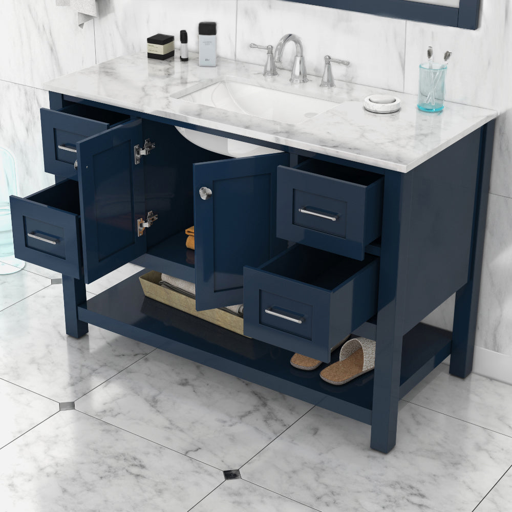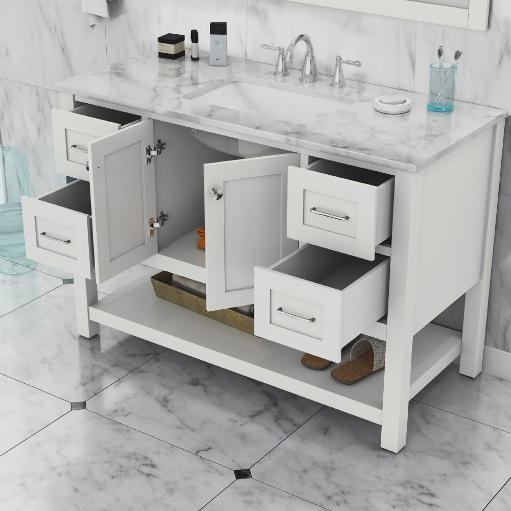 Alya Bath Wilmington Collection 48 inch bathroom vanity provides a contemporary design that is perfect for any bathroom remodel. This free standing, modern vanity built with solid wood construction, and offers two soft closing doors and four drawers with brushed nickel hardware. Each vanity comes fully assembled with the Carrara white marble top and ceramic sink is attached to the cabinet base for easy installation. This vanity has plenty of countertop space and a roomy open bottom shelf.