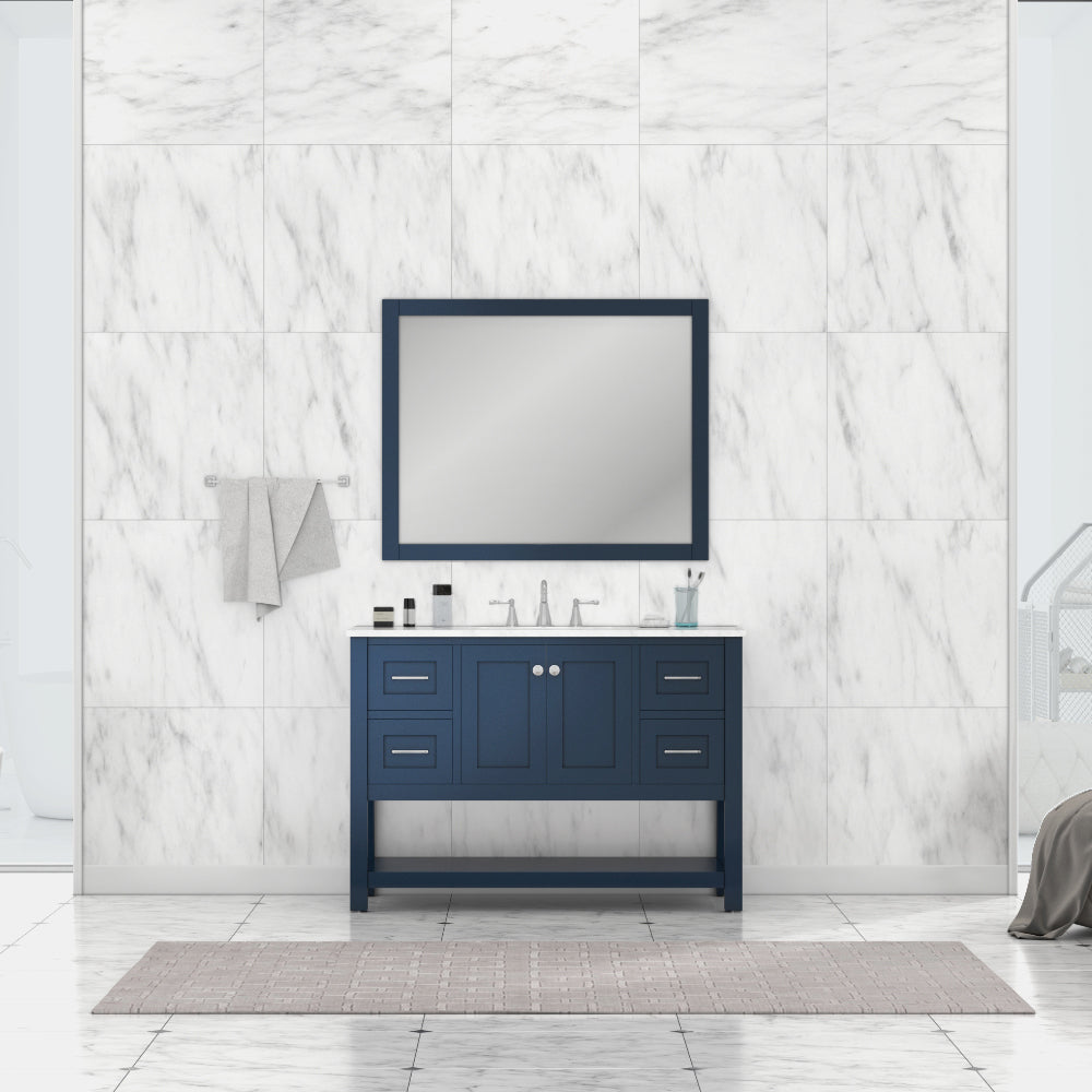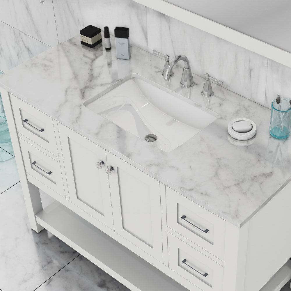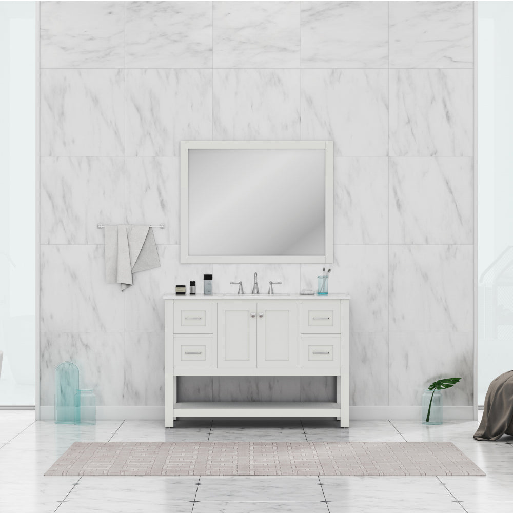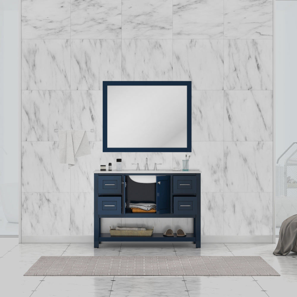 Alya Bath Wilmington Collection 48 inch bathroom vanity provides a contemporary design that is perfect for any bathroom remodel. This free standing, modern vanity built with solid wood construction, and offers two soft closing doors and four drawers with brushed nickel hardware. Each vanity comes fully assembled with the Carrara white marble top and ceramic sink is attached to the cabinet base for easy installation. This vanity has plenty of countertop space and a roomy open bottom shelf.