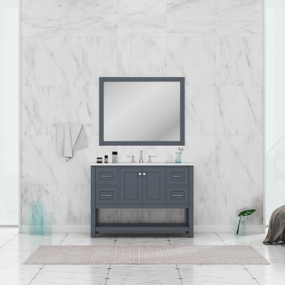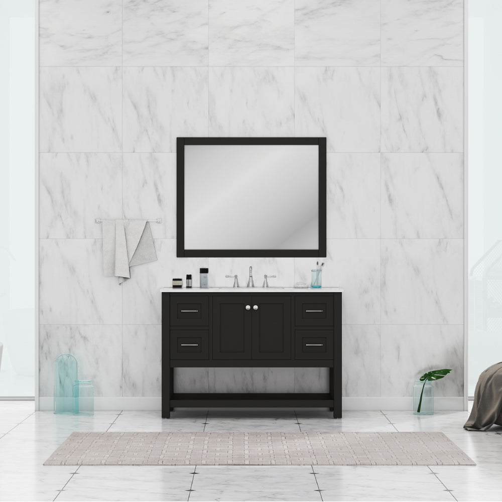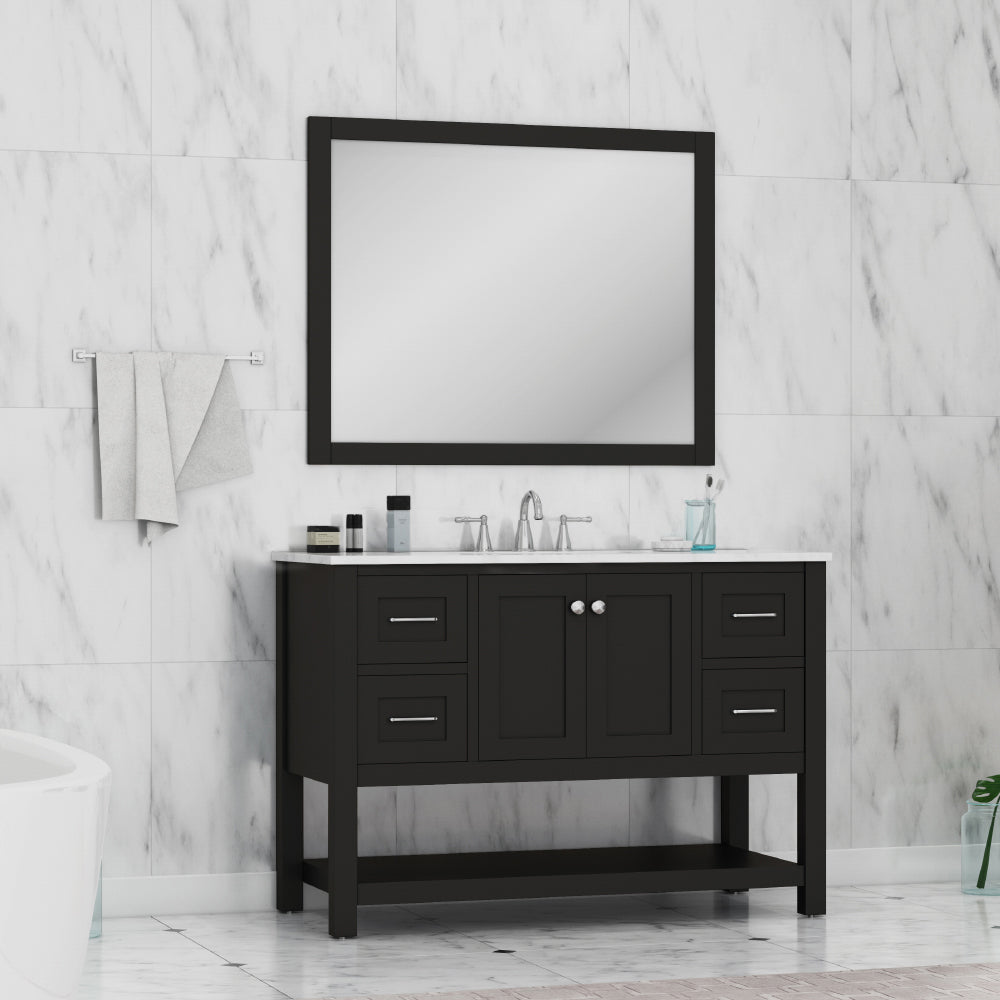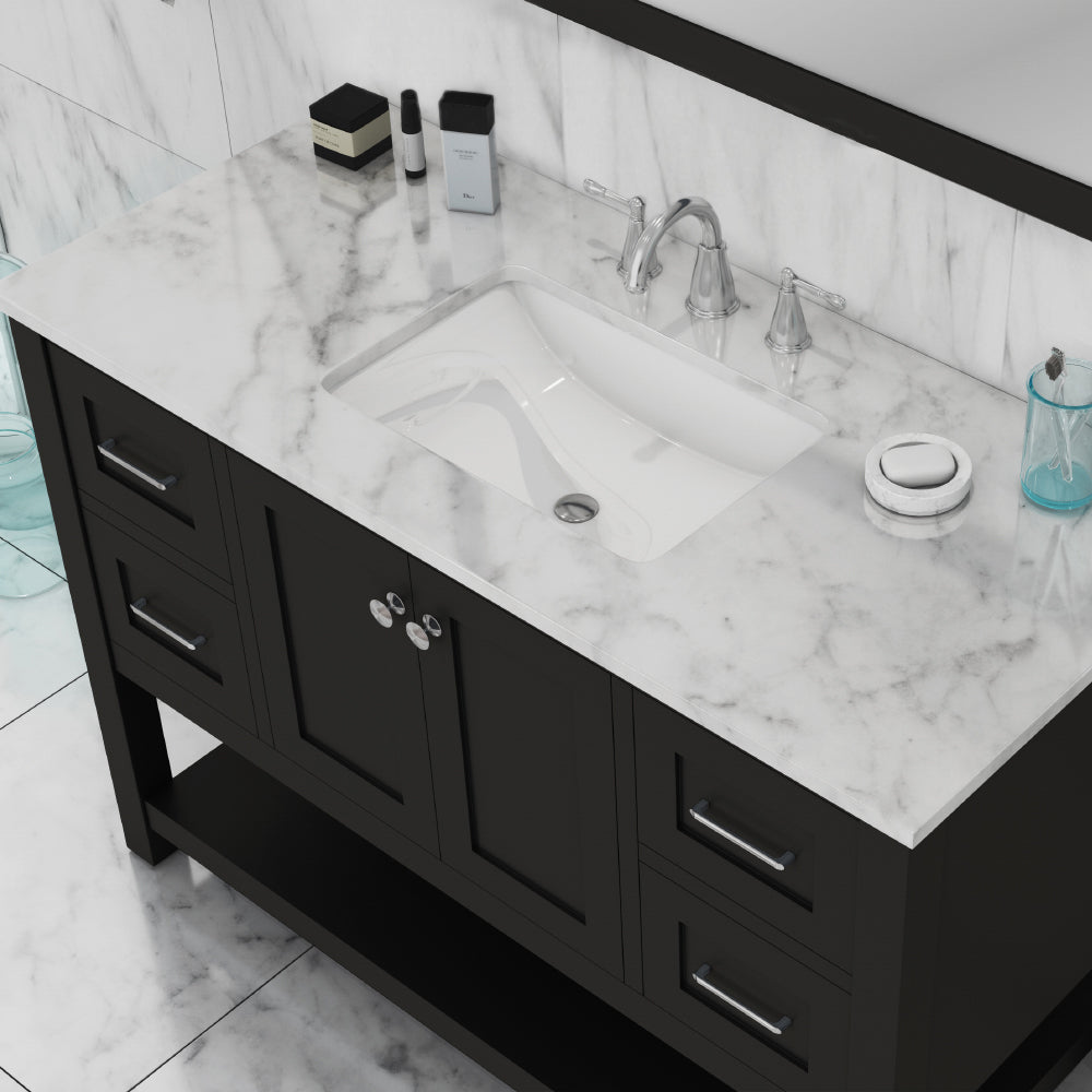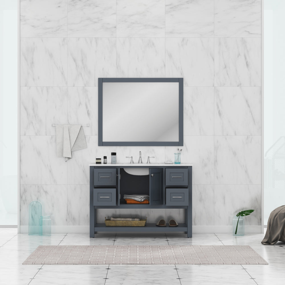 Alya Bath Wilmington Collection 48 inch bathroom vanity provides a contemporary design that is perfect for any bathroom remodel. This free standing, modern vanity built with solid wood construction, and offers two soft closing doors and four drawers with brushed nickel hardware. Each vanity comes fully assembled with the Carrara white marble top and ceramic sink is attached to the cabinet base for easy installation. This vanity has plenty of countertop space and a roomy open bottom shelf.