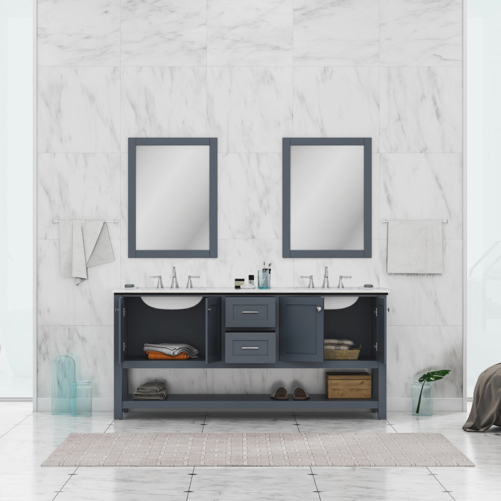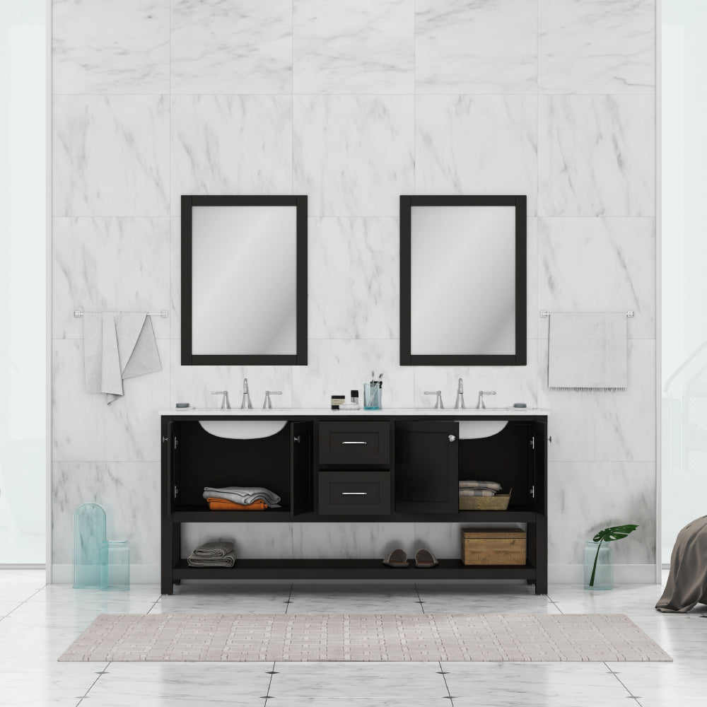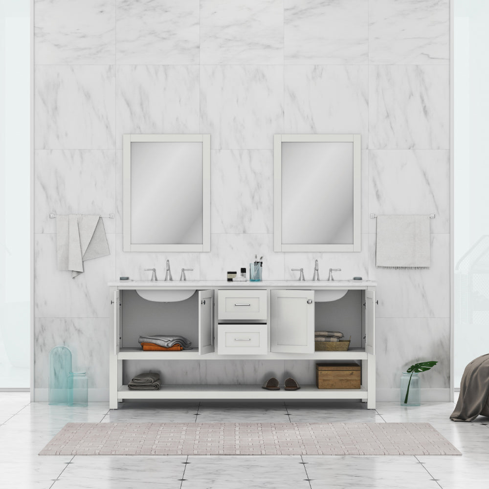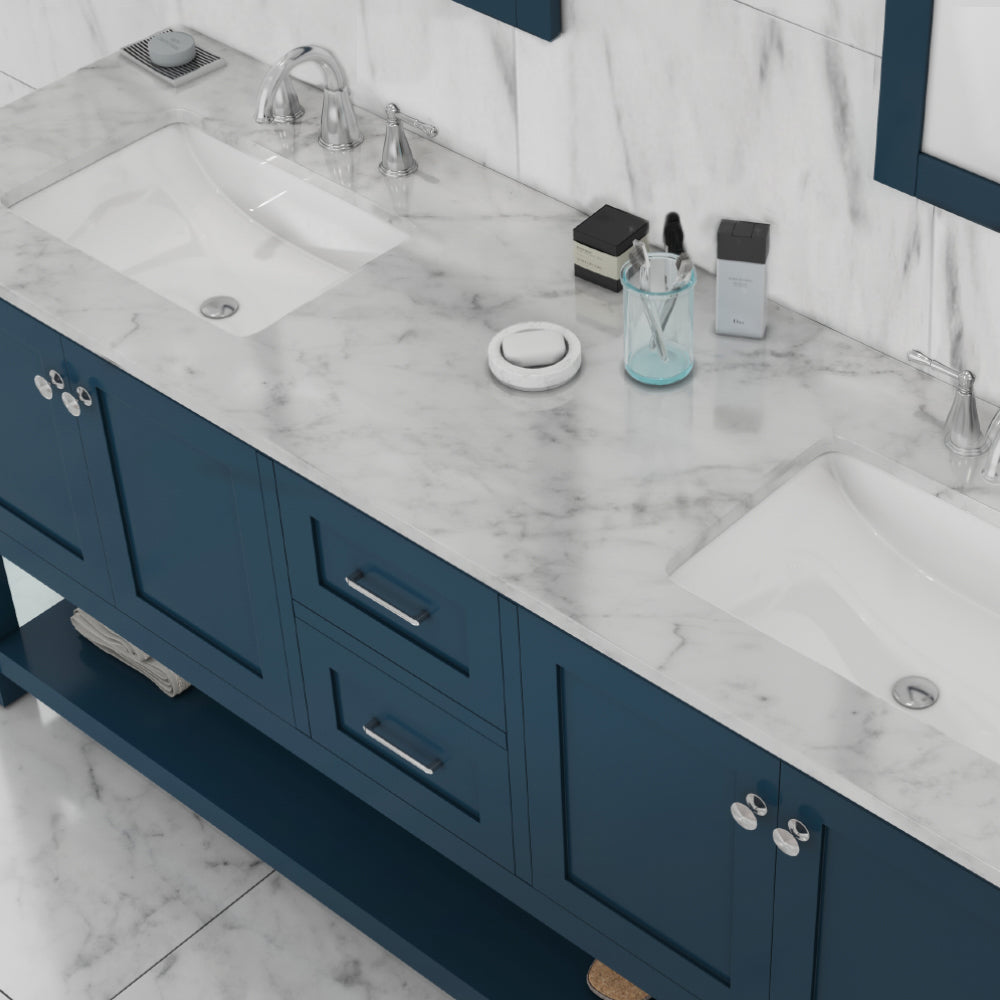 Alya Bath Wilmington Collection 72 inch bathroom vanity provides a contemporary design that is perfect for any bathroom remodel. This free standing, modern vanity built with solid wood construction, and offers four soft closing doors and two drawers with brushed nickel hardware. Each vanity comes fully assembled with the Carrara white marble top and ceramic sink is attached to the cabinet base for easy installation. This vanity has plenty of countertop space and a roomy open bottom shelf.