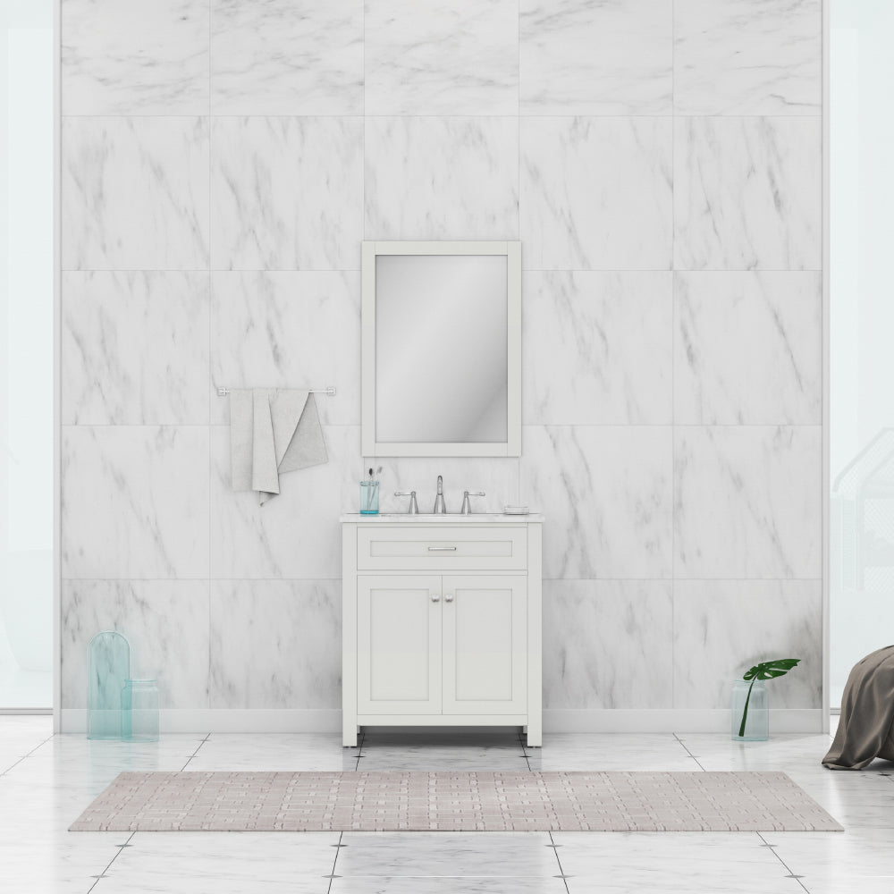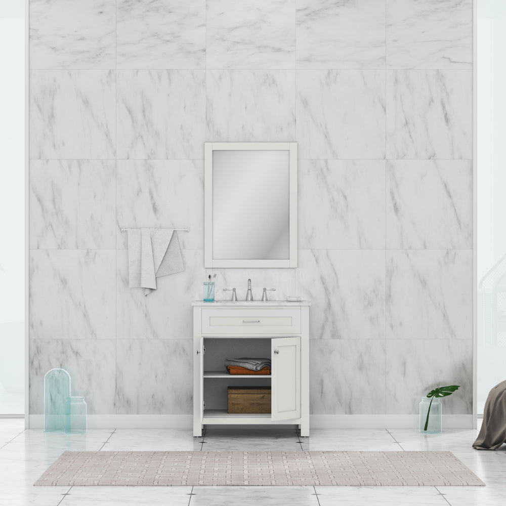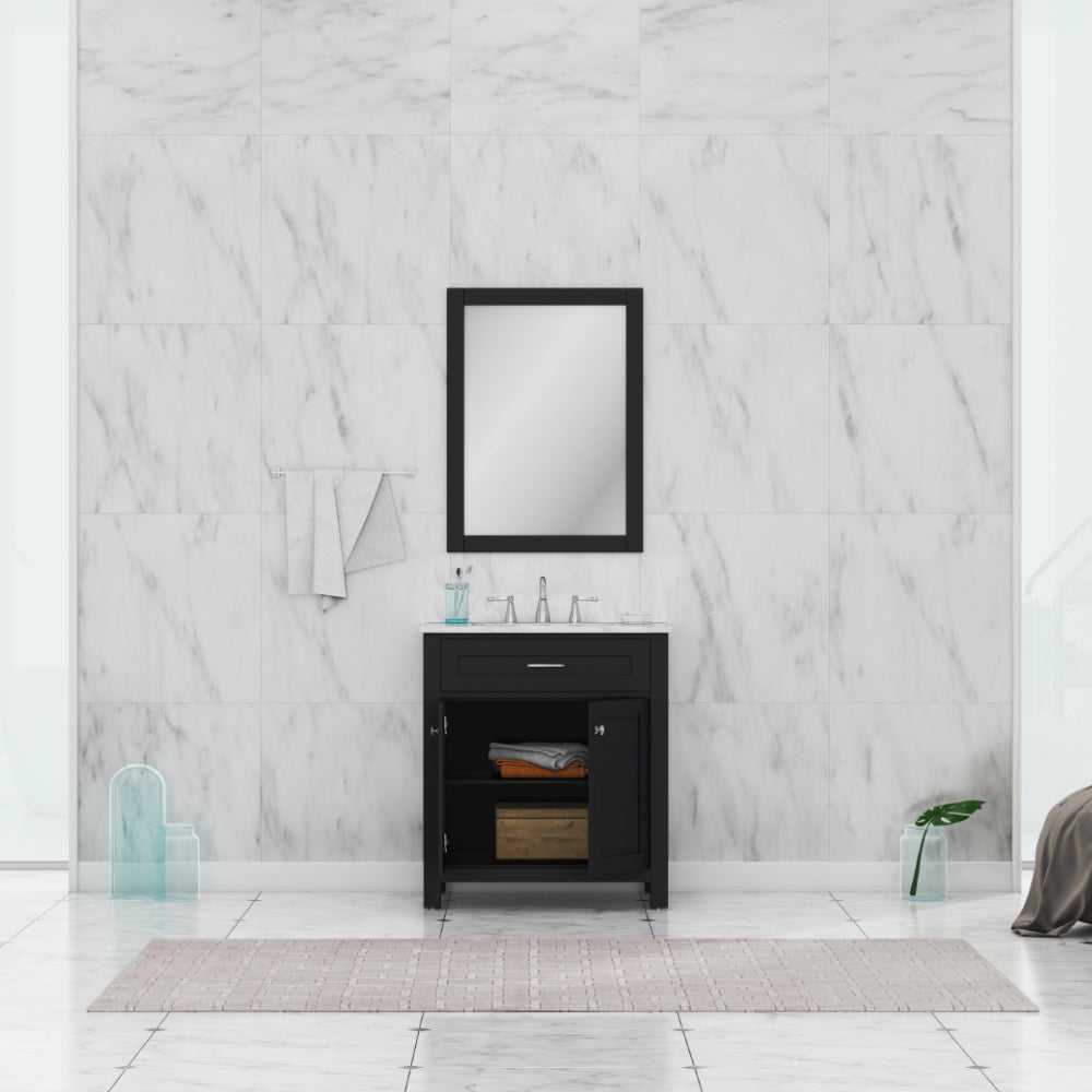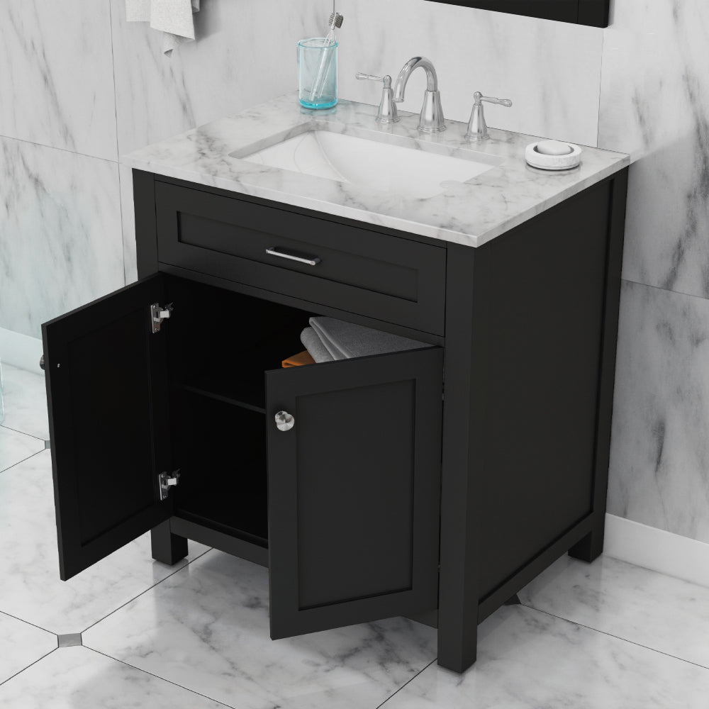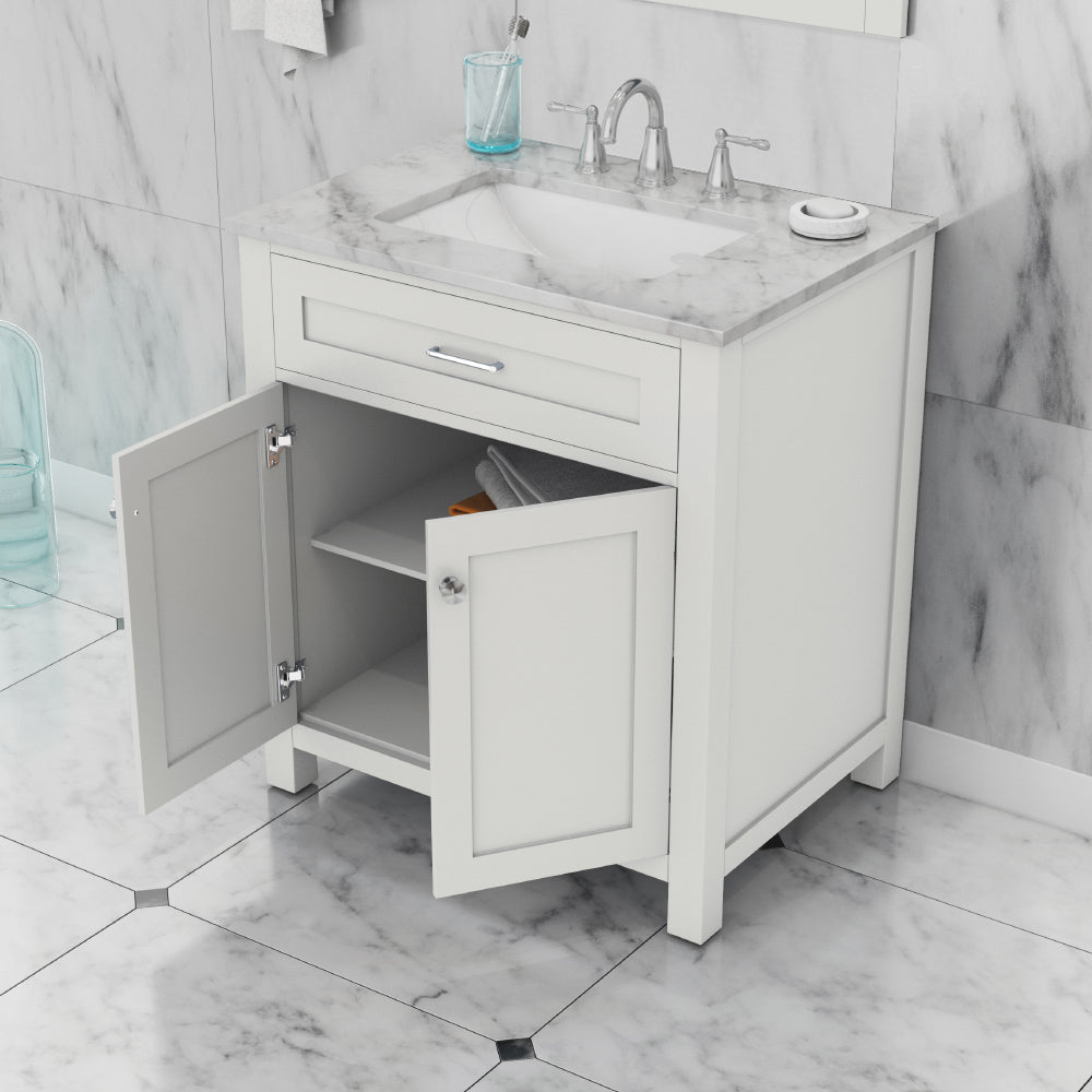 Alya Bath Norwalk Collection 30 inch bathroom vanity is built with solid wood construction, and offers a lifetime reliability. This free standing vanity includes two soft closing doors with brushed nickel hardware that adds a modern appeal. Each vanity comes fully assembled with Carrara marble top and ceramic sink is attached to the cabinet base for easy installation. Designed with a small bathroom space in mind, this transitional vanity has plenty of countertop and cabinet space for all of your storage needs.