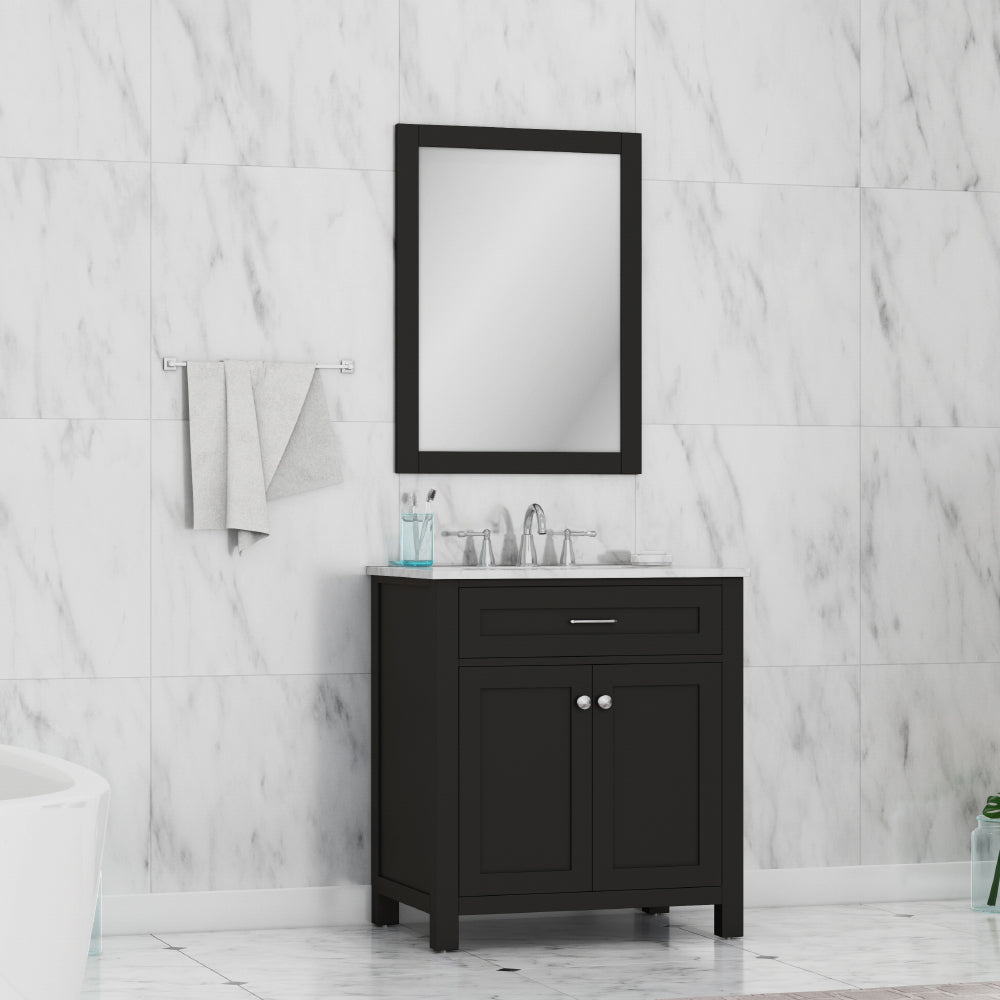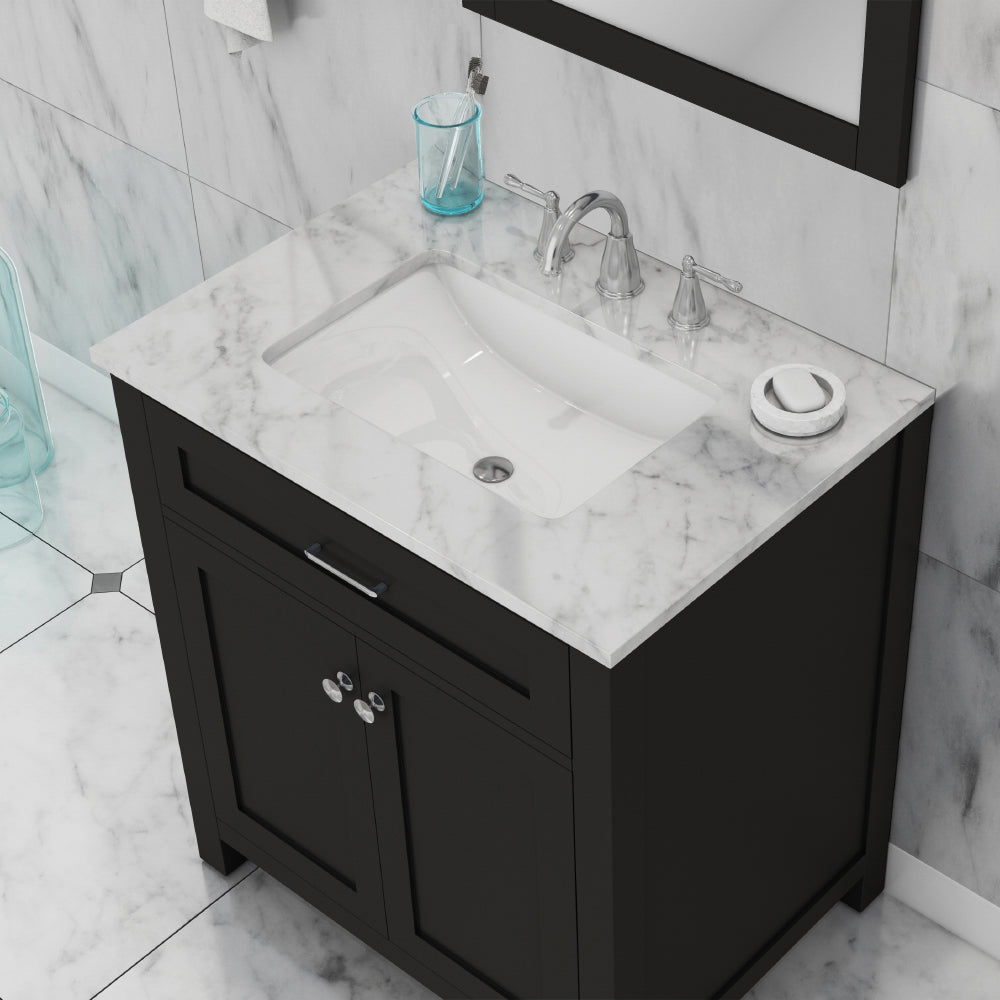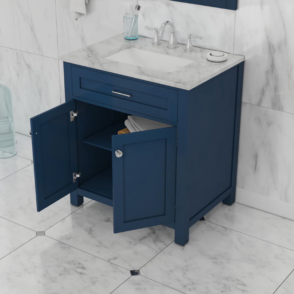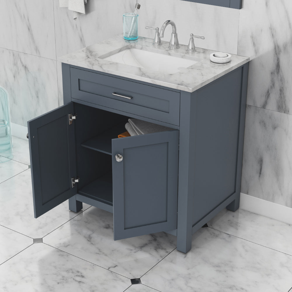 Alya Bath Norwalk Collection 30 inch bathroom vanity is built with solid wood construction, and offers a lifetime reliability. This free standing vanity includes two soft closing doors with brushed nickel hardware that adds a modern appeal. Each vanity comes fully assembled with Carrara marble top and ceramic sink is attached to the cabinet base for easy installation. Designed with a small bathroom space in mind, this transitional vanity has plenty of countertop and cabinet space for all of your storage needs.