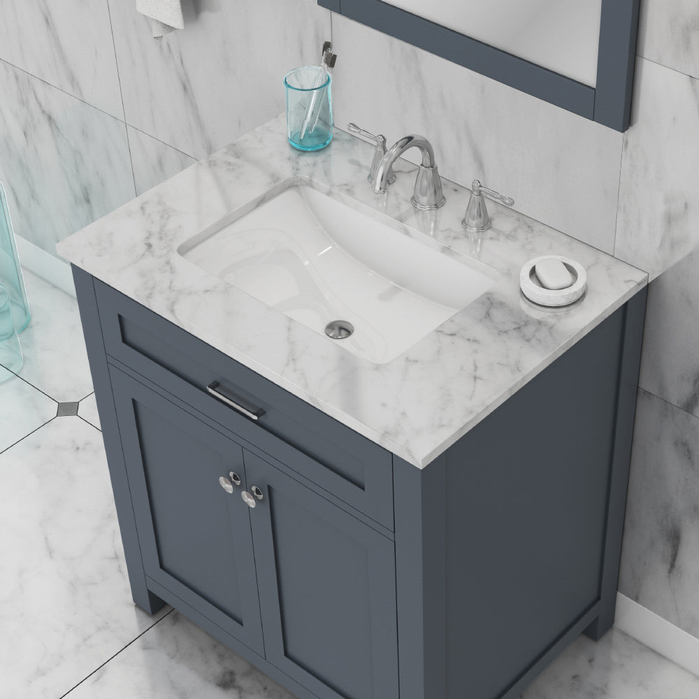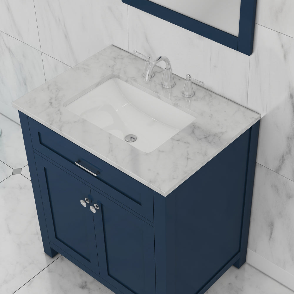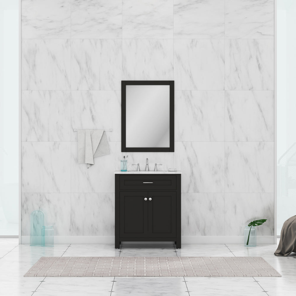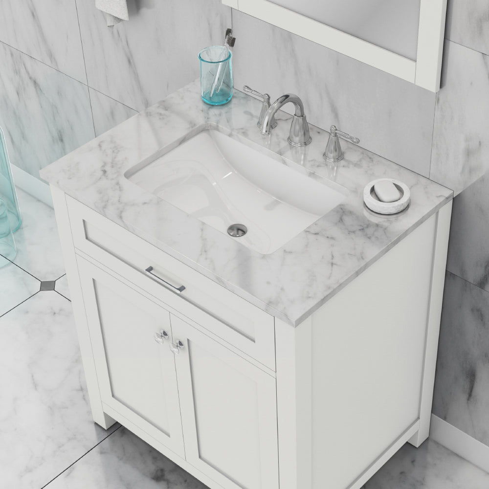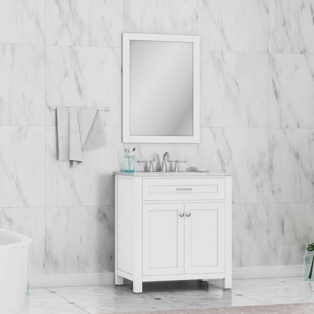 Alya Bath Norwalk Collection 30 inch bathroom vanity is built with solid wood construction, and offers a lifetime reliability. This free standing vanity includes two soft closing doors with brushed nickel hardware that adds a modern appeal. Each vanity comes fully assembled with Carrara marble top and ceramic sink is attached to the cabinet base for easy installation. Designed with a small bathroom space in mind, this transitional vanity has plenty of countertop and cabinet space for all of your storage needs.