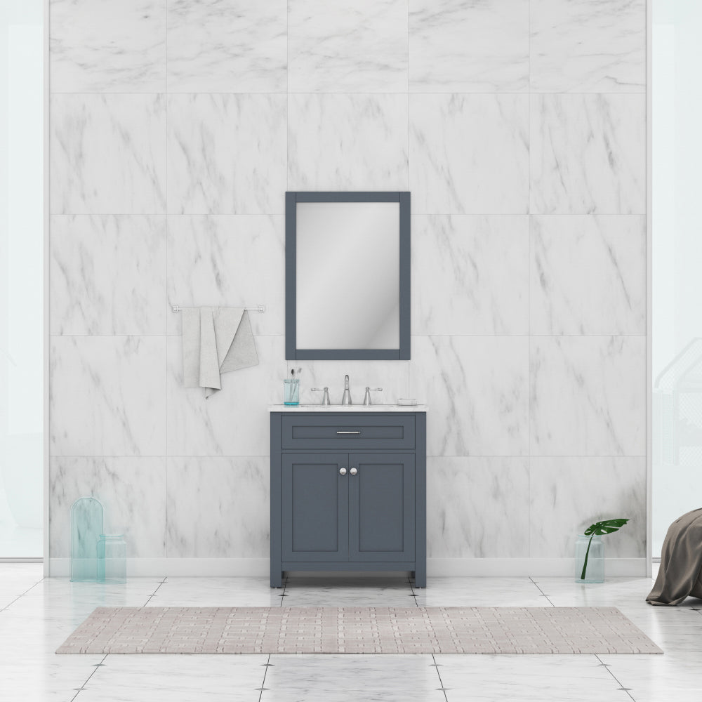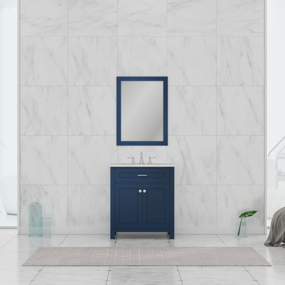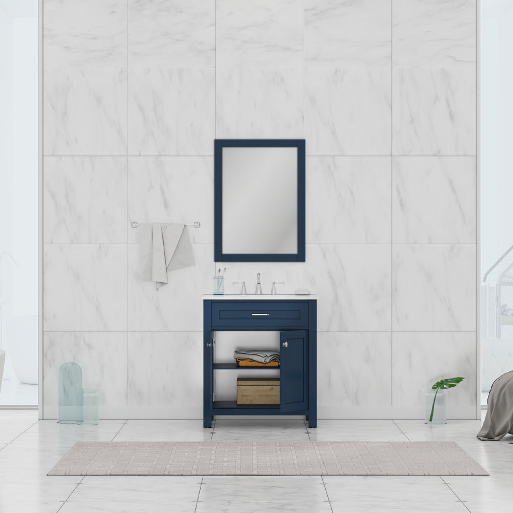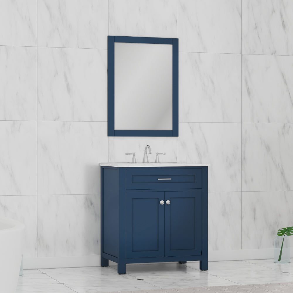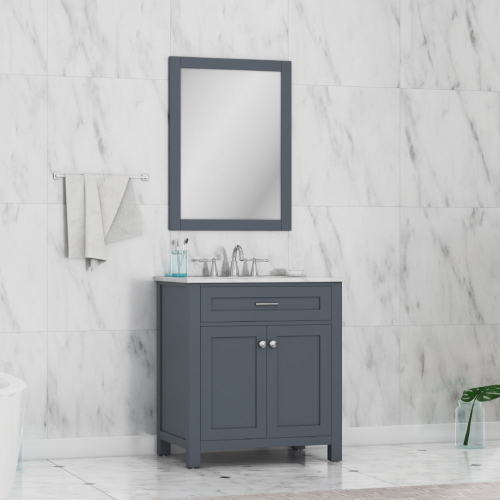 Alya Bath Norwalk Collection 30 inch bathroom vanity is built with solid wood construction, and offers a lifetime reliability. This free standing vanity includes two soft closing doors with brushed nickel hardware that adds a modern appeal. Each vanity comes fully assembled with Carrara marble top and ceramic sink is attached to the cabinet base for easy installation. Designed with a small bathroom space in mind, this transitional vanity has plenty of countertop and cabinet space for all of your storage needs.